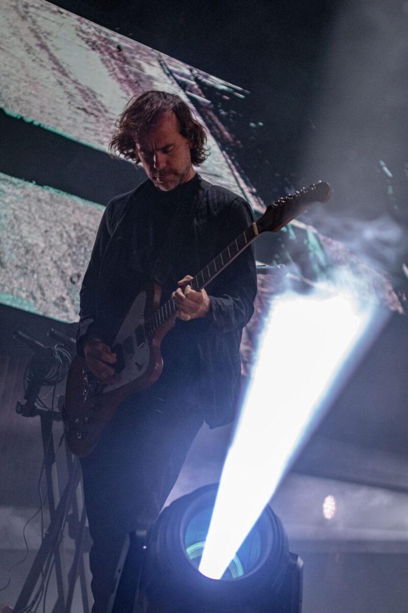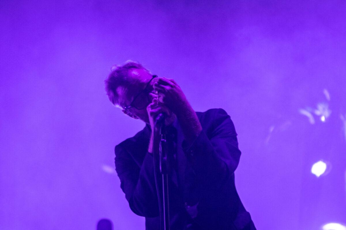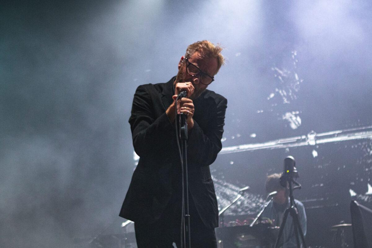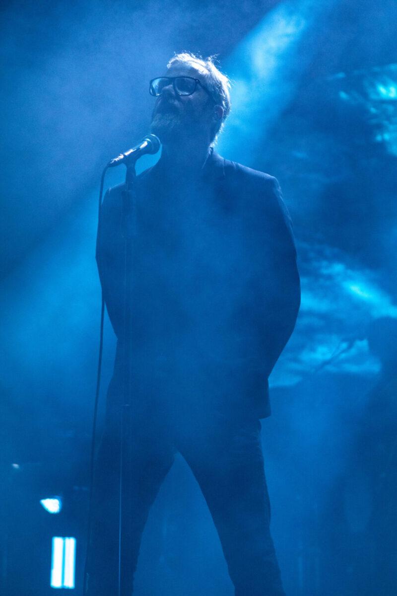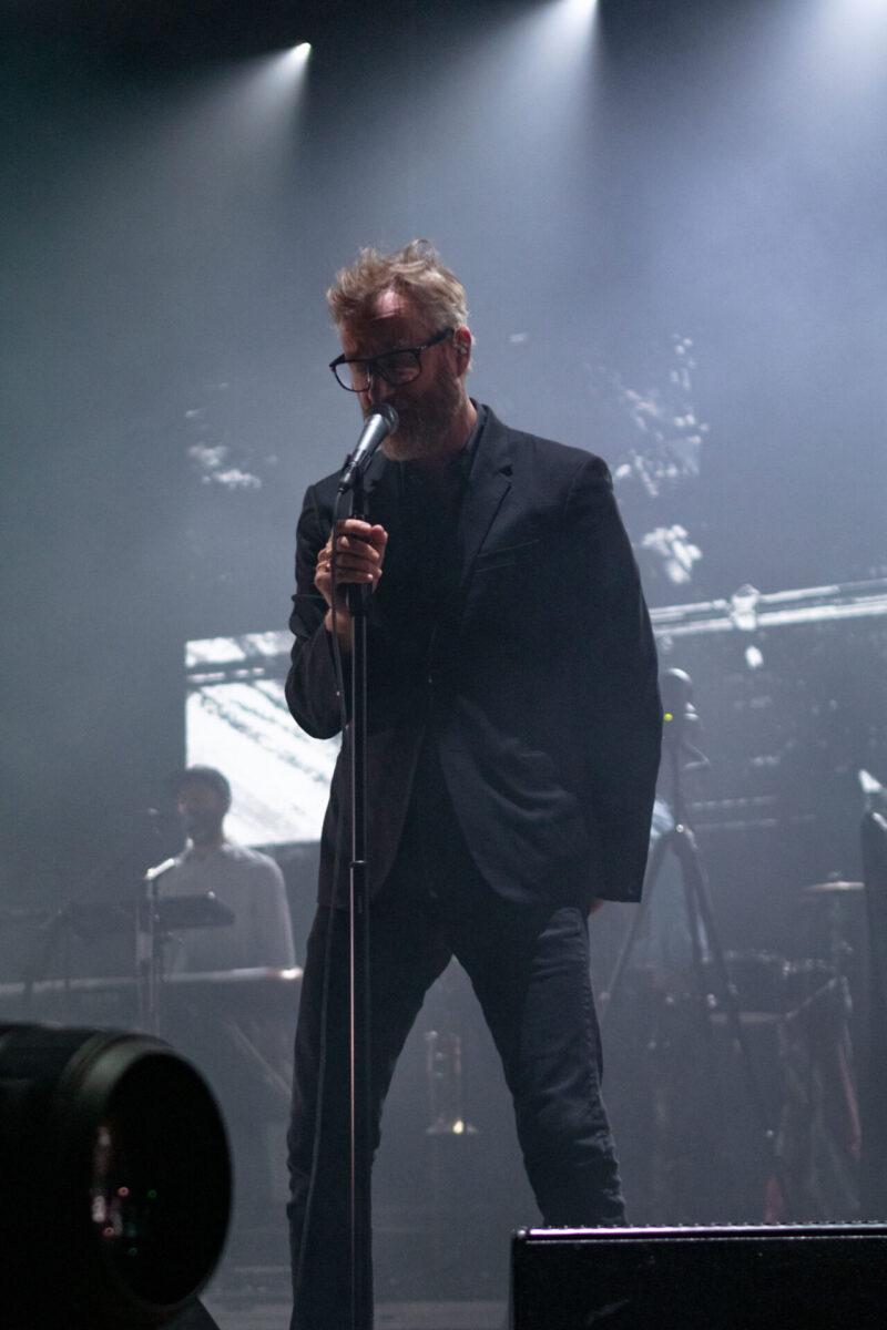 They began the set with the first two tracks from I Am Easy to Find, “You Had Your Soul With You” and “Quiet Light,” as the glowing screens filled with real-time footage of the band on stage in black and white, overwhelmed by glaring spotlights, with blotches of paint layered on top of the footage. Gentle purple and blue spotlights swelled on “Quiet Light” as Bryce’s guitar began to screech. On both the first two selections, as well as “Oblivions” and “The Pull Of You,” cascading layers of drums – McAlister and Bryan Devendorf played two separate kits – drove the music forward and built a sense of perpetual tension. The band has developed an instinct for this kind of tension, building it but never breaking it throughout much of I Am Easy to Find, just like on 2017’s Sleep Well Beast and 2013’s Trouble Will Find Me. At the end of “The Pull Of You,” under fiery pink lights, Berninger raised his voice to a yell for the first time as guitars and crashing cymbals tore the song apart.