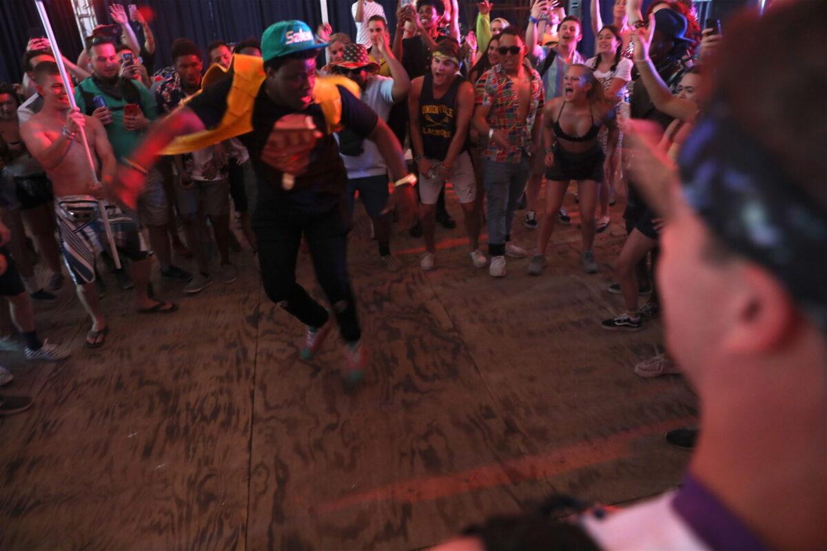 When 6:00 rolled around, it was to take a dinner break and watch some of the techno craziness taking place at the Prism Stage. The crowd started to grow and get a little drunker so I guess dancing to White Panda while he played snippets of hit songs is what one does in that situation? Think of it as Stars on 45 but live and with a dude wearing a giant panda suit and you get the idea.