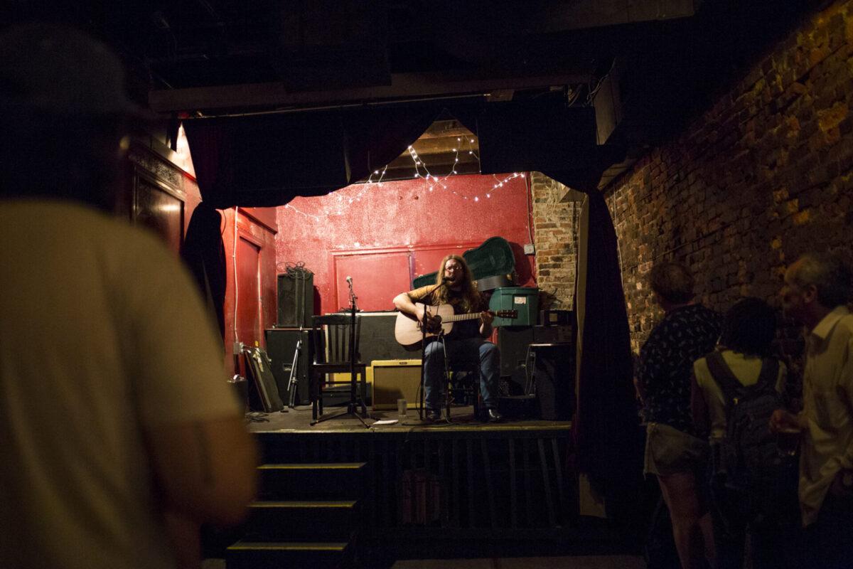 The Khyber shifted into full-on restaurant mode by the early teens — rightfully so, it’s a fantastic place to eat — but this year, it’s looking to bring music back within its walls and reclaim its spot in Philly’s venue landscape. The exposed brick upstairs room was refurbished, the stage freshened up with christmas lights and an ornate curtain, and Cook-Parrott provided a test run with a solo RadHos gig on Sunday. His bandmate Cynthia Schemmer opened the night with a performance by her solo project Swanning, and Appleton, Wisconsin’s Tim Buchanan took the middle slot.