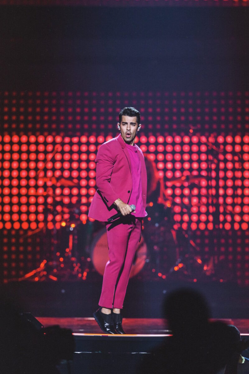When Nick, Kevin, and Joe arrived on stage they wore brightly colored suits: green, purple, and red respectively. The stages were outrageously elaborate, equipped with fireworks, fire cannons, sky-high elevating platforms, neon circles on an enormous mobile, rainbow confetti, and even giant tube men. It was some next level camp.
