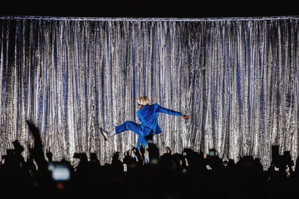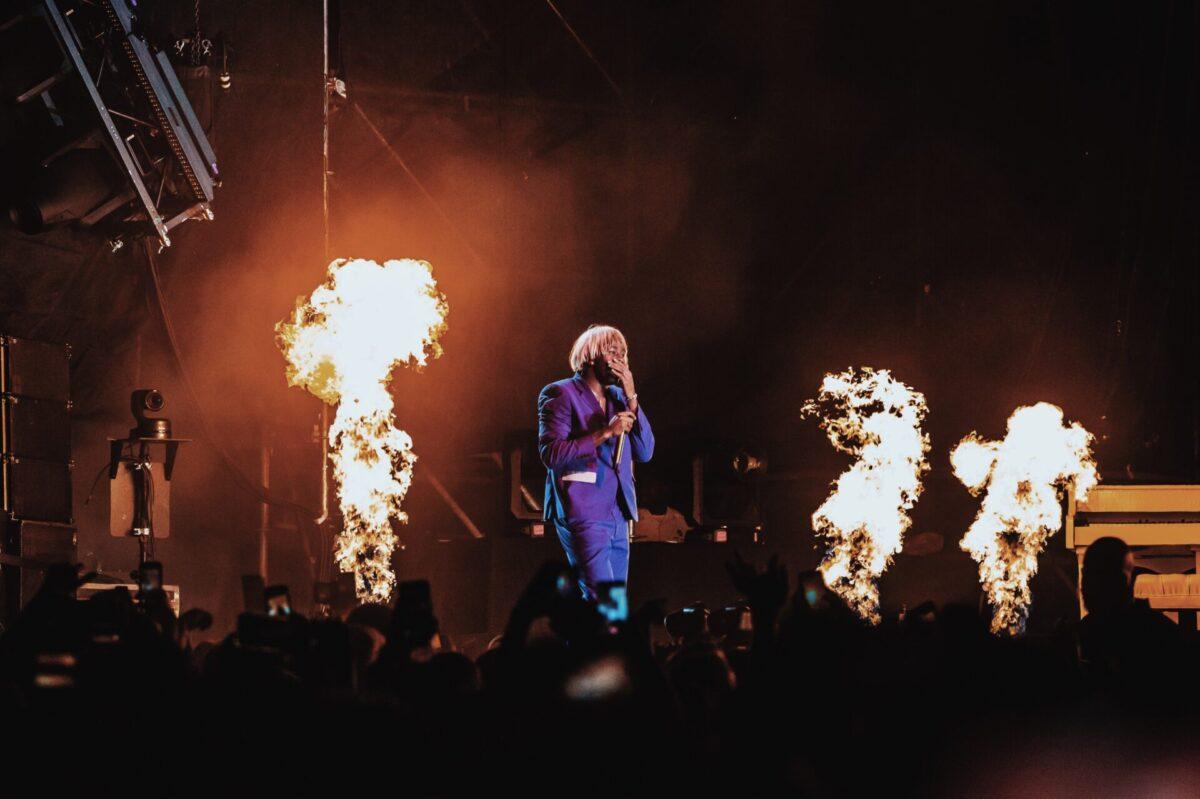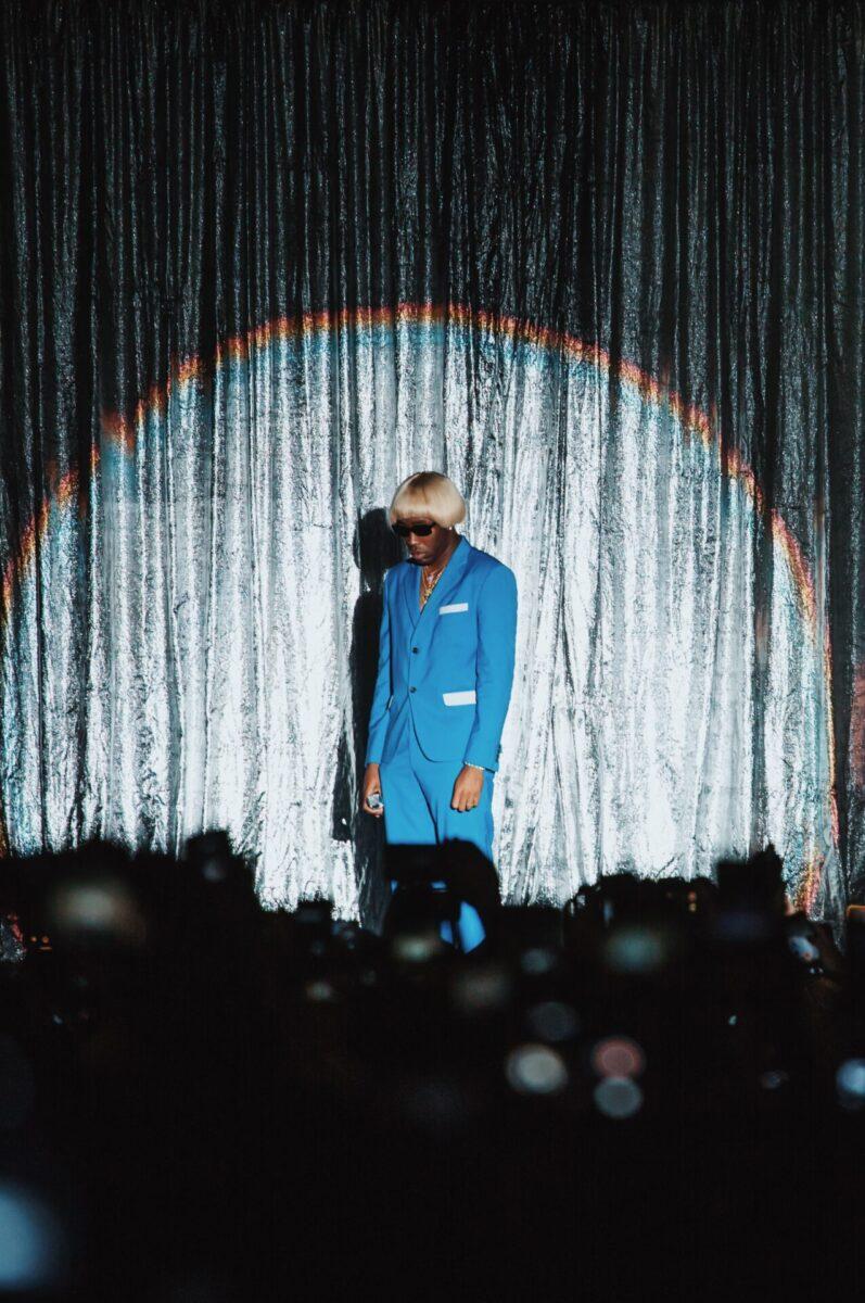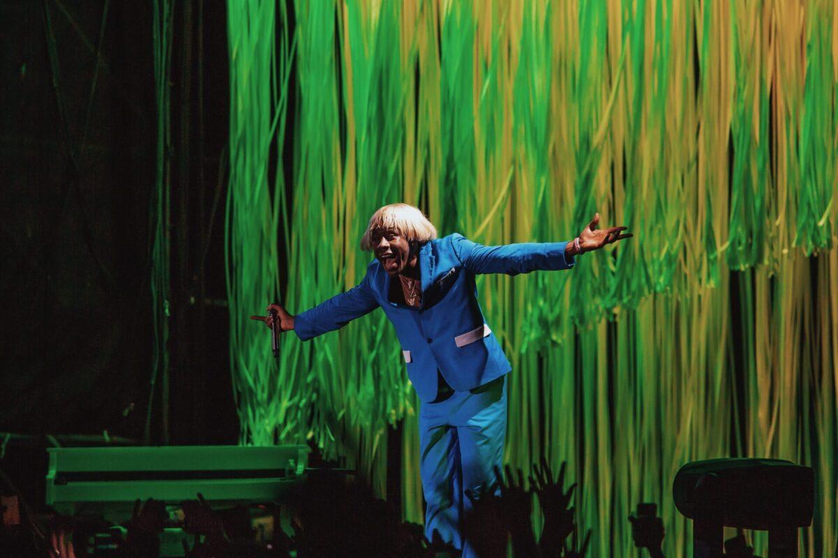Things you might see at a Tyler, the Creator concert: gold hair and gold chains. An iridescent blue two-piece suit that gets progressively more disheveled as the night goes on. A person holding a mic, doing high-kicks and spins, moving deftly between so many bursts of actual fire. A quick breather as they sit on a piano stool to plunk out the introduction to the mega-banger “Earfquake,” then leaping to their feet when the beat drops.