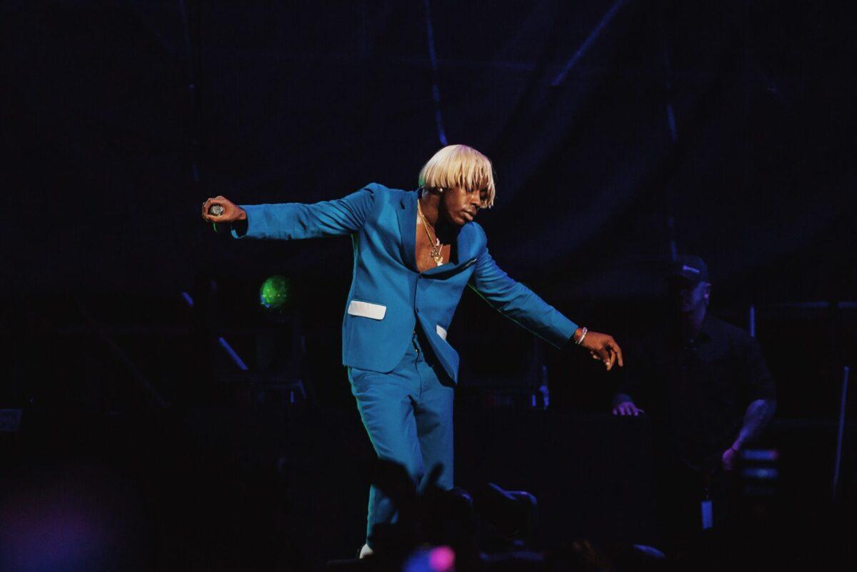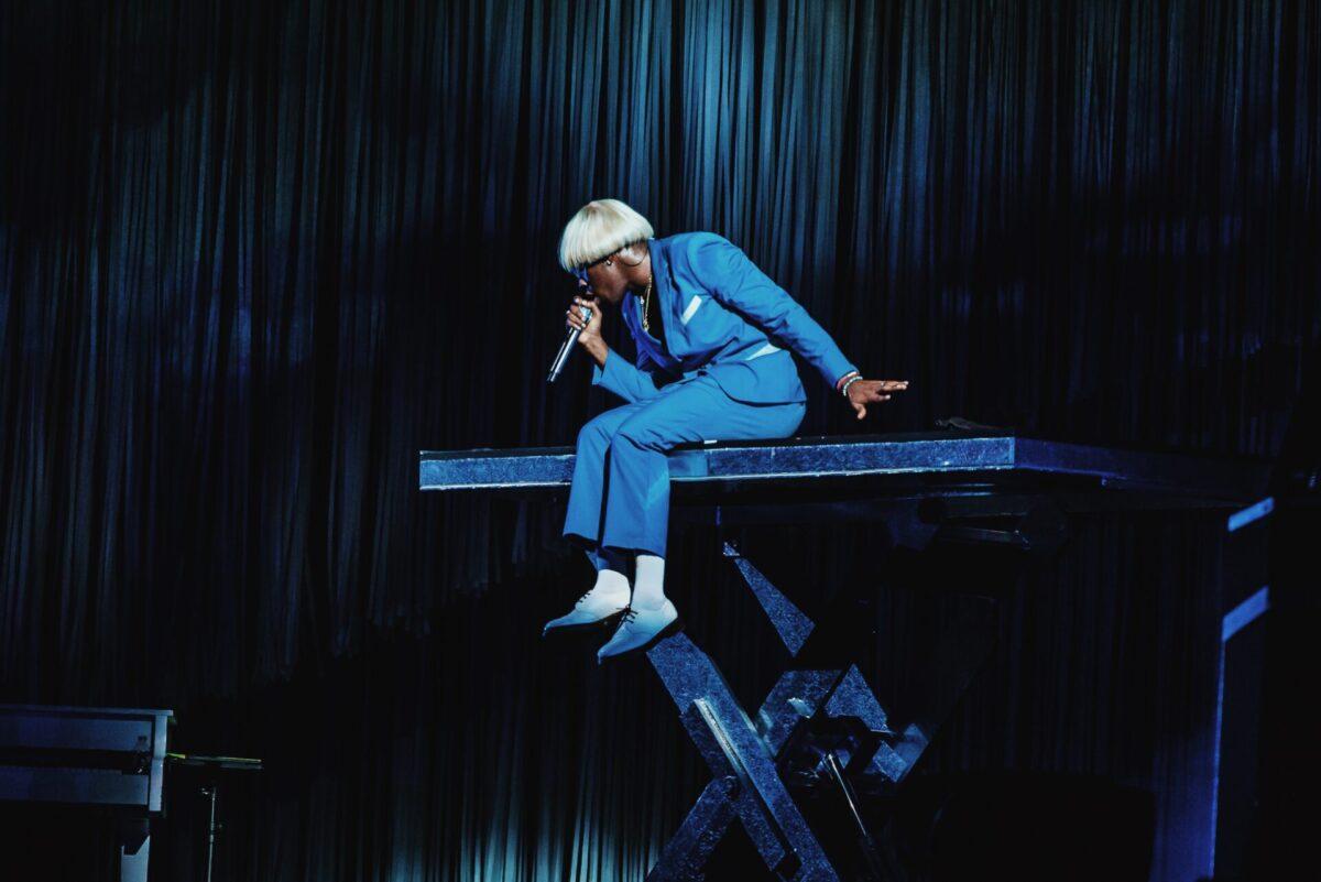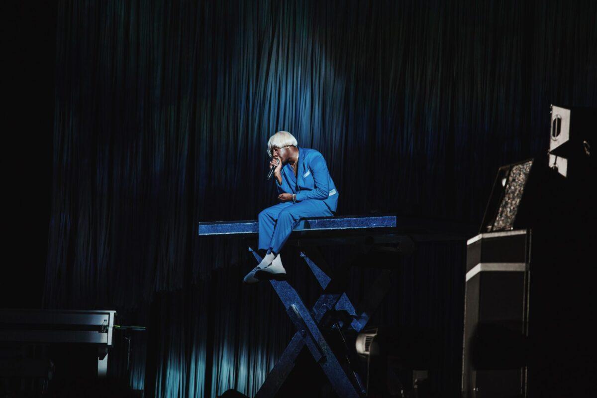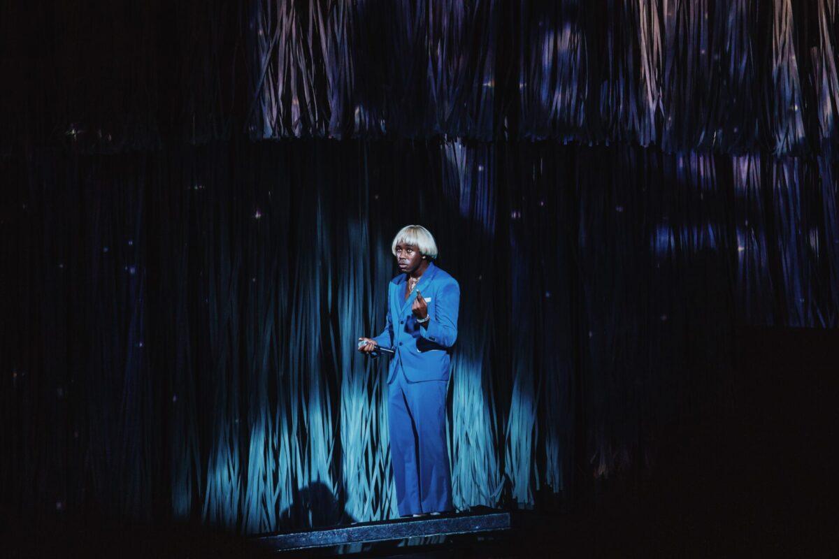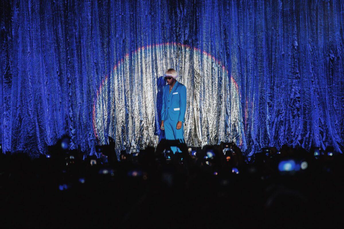 Things you might see at a Tyler, the Creator concert: gold hair and gold chains. An iridescent blue two-piece suit that gets progressively more disheveled as the night goes on. A person holding a mic, doing high-kicks and spins, moving deftly between so many bursts of actual fire. A quick breather as they sit on a piano stool to plunk out the introduction to the mega-banger “Earfquake,” then leaping to their feet when the beat drops.