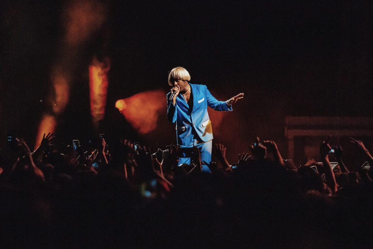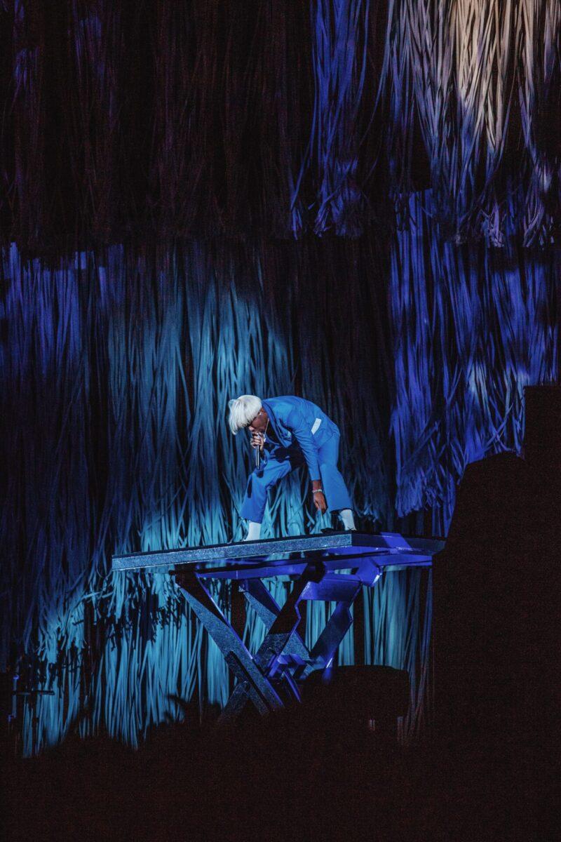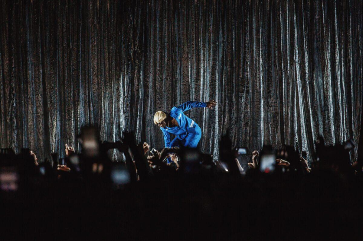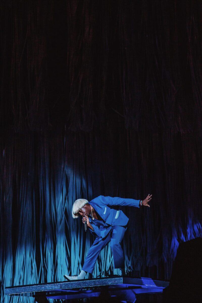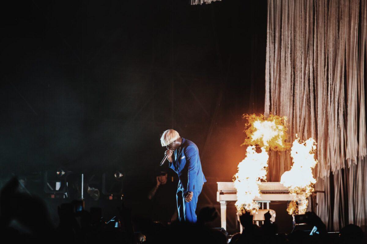 Things you might see at a Tyler, the Creator concert: gold hair and gold chains. An iridescent blue two-piece suit that gets progressively more disheveled as the night goes on. A person holding a mic, doing high-kicks and spins, moving deftly between so many bursts of actual fire. A quick breather as they sit on a piano stool to plunk out the introduction to the mega-banger “Earfquake,” then leaping to their feet when the beat drops.