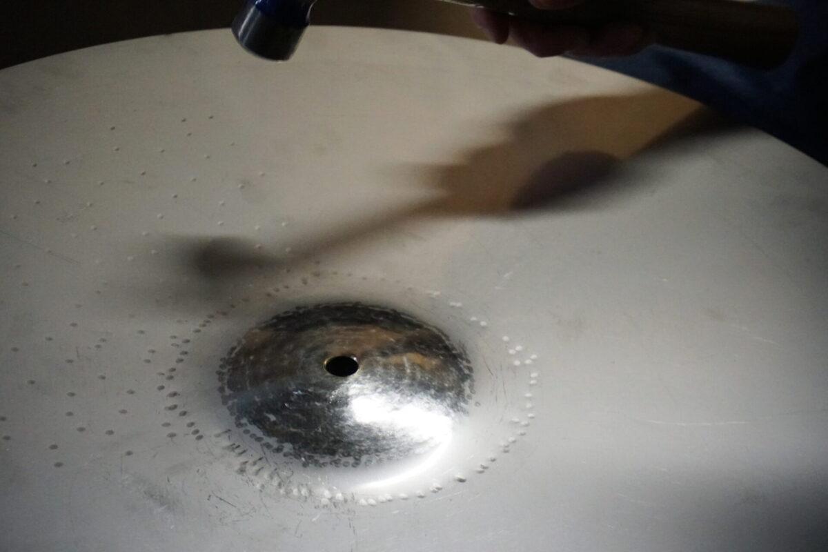 Before hammering his first cymbal, Mongiello had to fabricate an anvil, which he carved out of a piece of steel, and also modify a bunch of ball-peen hammers, which are his main tools. Since there’s no “Cymbal Making For Dummies” Book or even a plethora of YouTube videos – despite the literal millions of drummers in the world, this really is as obscure as it sounds – he reached out to the small community of DIY handmade cymbal makers for advice.
