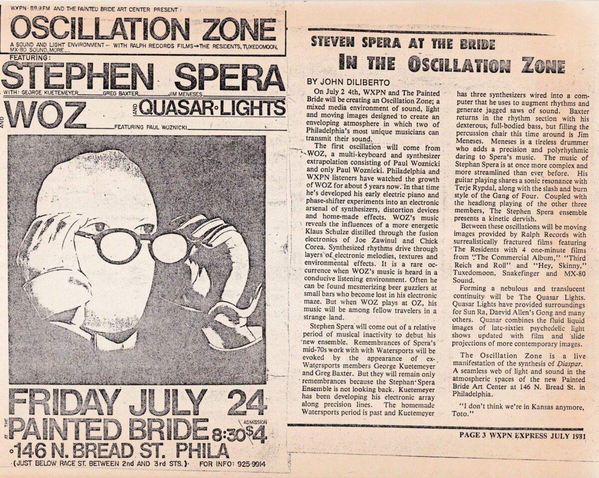 The live scene was pretty active. The Painted Bride used to have some of these shows, people like [80s synth-pop ensemble] WOZ would play there. XPN sponsored a series of concerts called The Oscillation Zone and they were at different venues. Philadelphia electronic musicians like Darren Kearns, Dave Lunt, people like that. There was a series called F.O.P.P.E.M. [Festival of Performing Philadelphia Electronic Musicians] that Charles Cohen curated. XPN would put on gigs all the time, with groups like [Ruffhouse Records founder] Chris Schwartz’s and Jeff Coulter’s band Tangent.