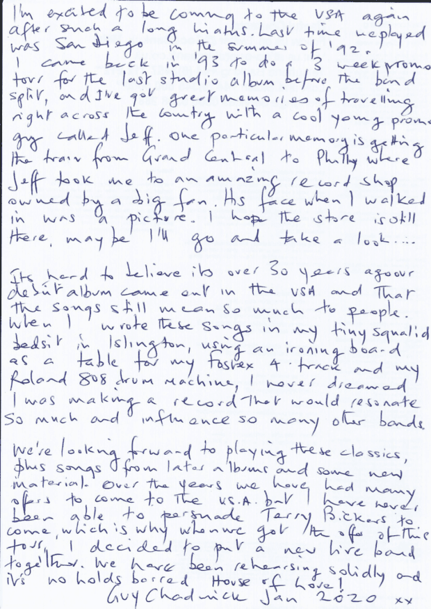 Chadwick says that when he was writing The House of Love album, “I never dreamed I was making a record that would resonate so much and influence so many other bands.” Read his full handwritten statement below.