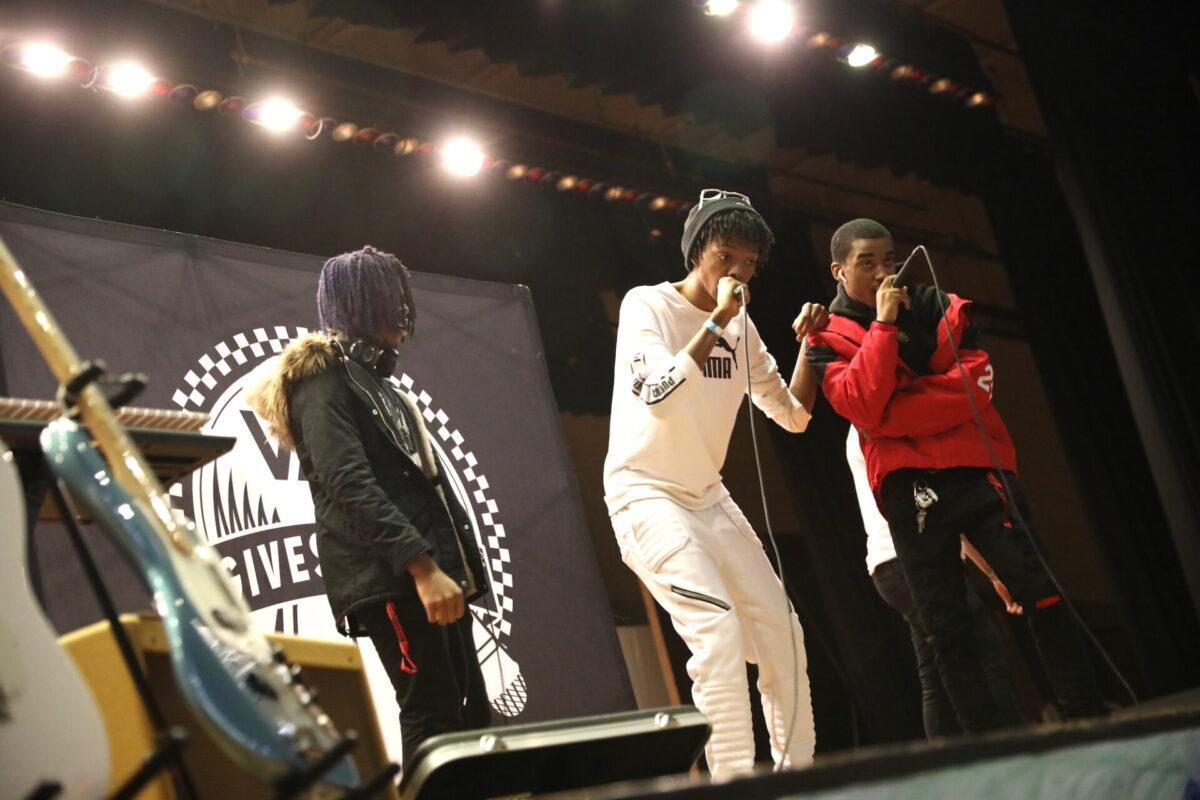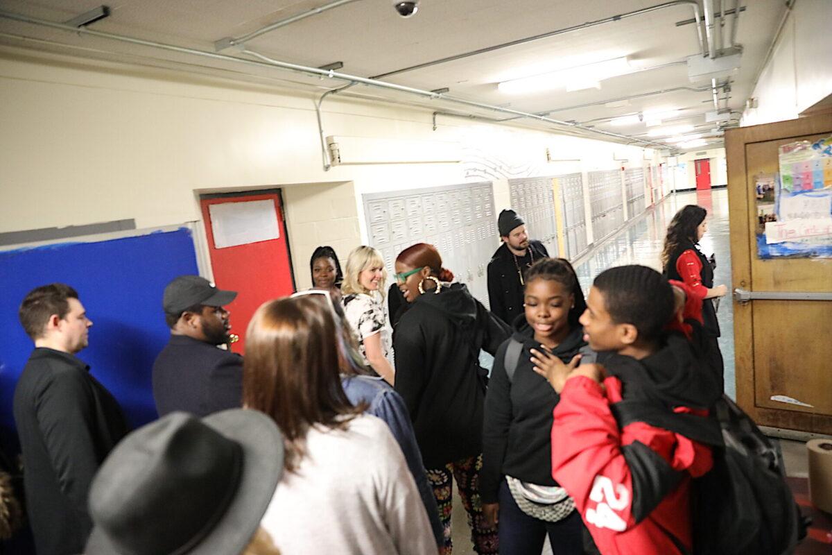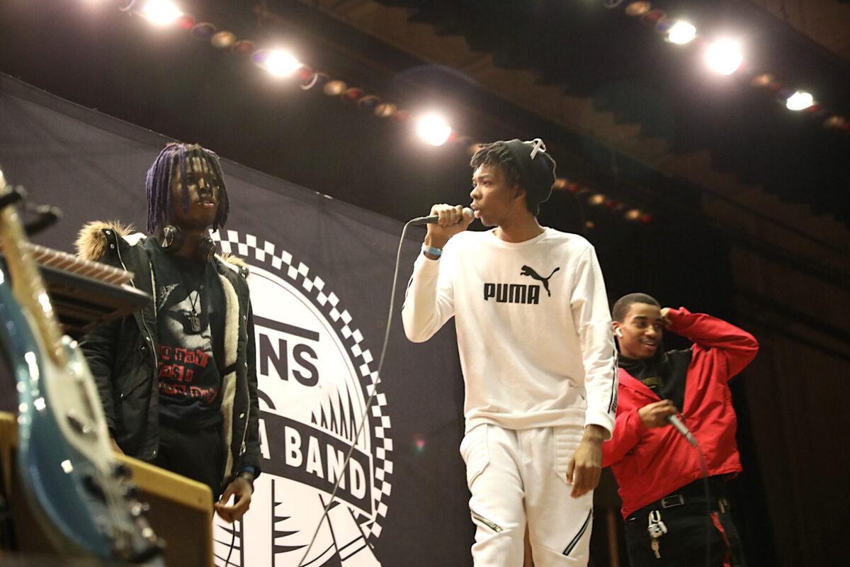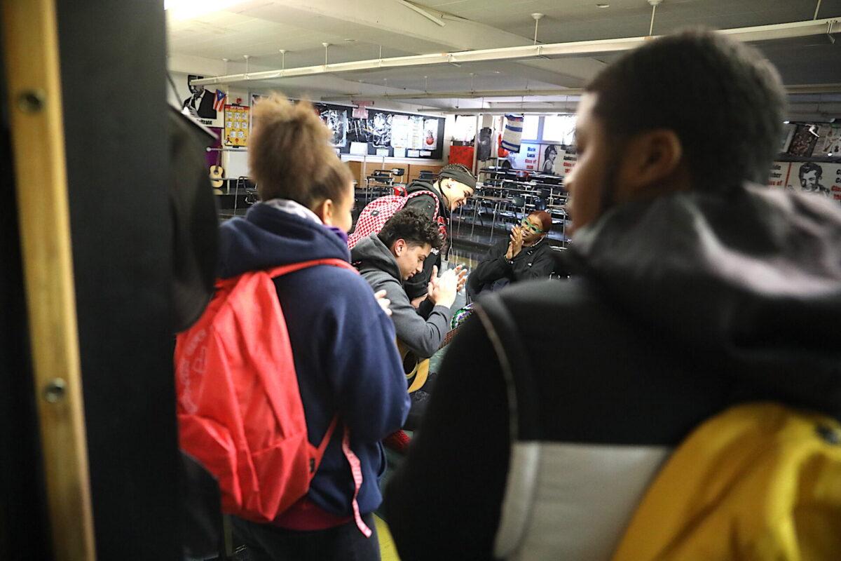 After presenting the musical instruments as part of an assembly in front of the entire student body gathered in the auditorium — an event which included a group of budding rappers from the school taking the stage for a freestyle, and a teacher jumping into the cypher at one point — Whack linked up with a group of music students and teachers to visit their instruction and recording space.
