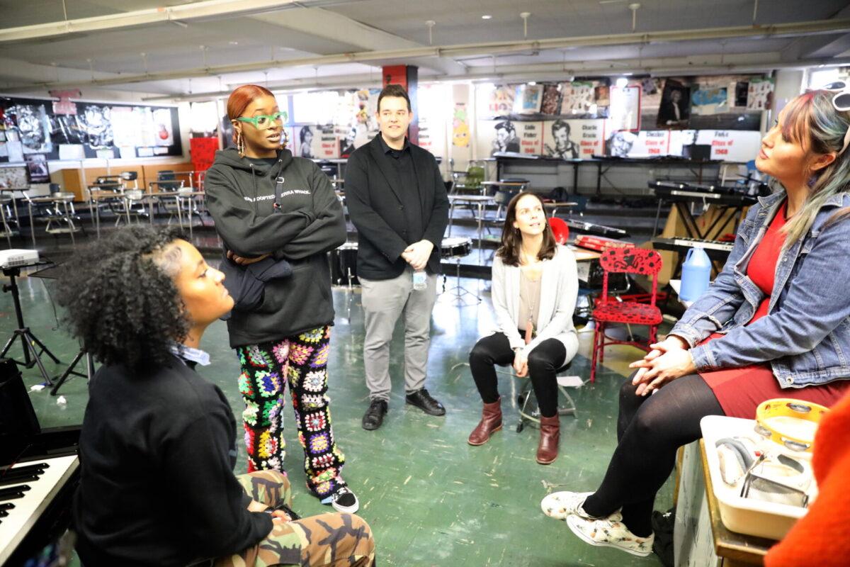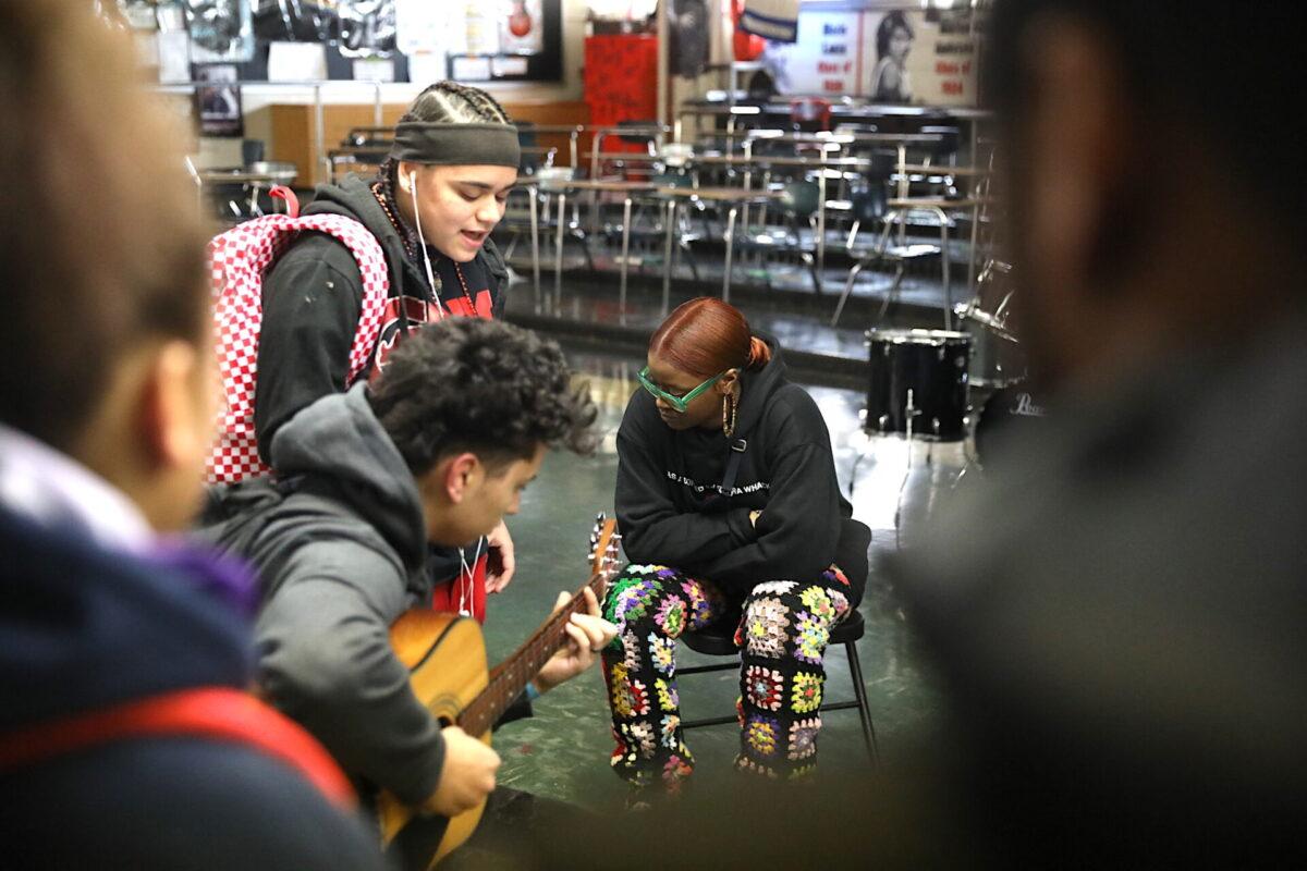 In the larger group room, Whack encouraged one of the students — whose peers had spoken about her talent but who was shy about performing — to take a moment to sing for everyone. Accompanied by a friend on acoustic guitar, the student delivered a moving performance of a Spanish language song with a poppy, emotional melody while Whack sat and listened intently.