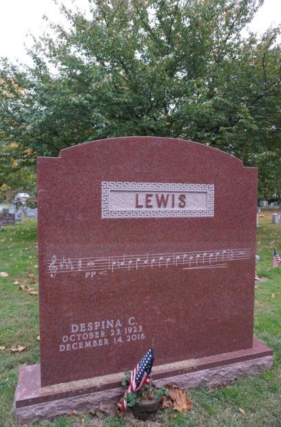 Despina Lewis passed away in 2016 and is buried in West Laurel Hill Cemetery. Her grave is adorned with the notation to an unnamed song.