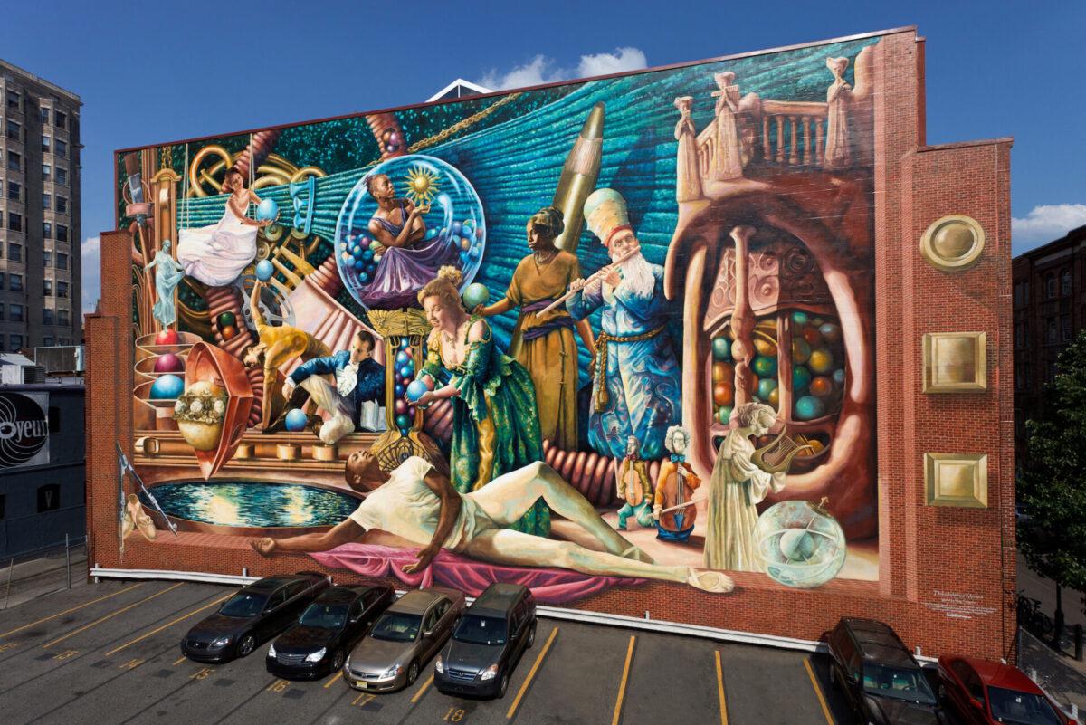 Philadelphia Muses is a 6000-square foot mural at 13th and Locust Streets. Pulsing with creative force, this arresting mural alludes to the classical muses to celebrate the spirit of Philadelphia’s artists in disciplines as diverse as architecture, painting, ballet, music, and theater.
