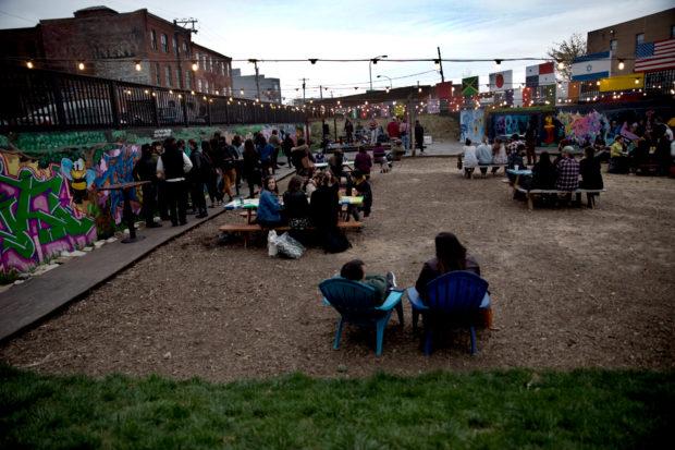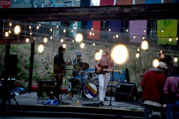 The limited capacity gig sold out well in advance, and the scene inside was bright and lively. Groups of friends caught up in a clustered row of high-tops along the west wall, others kept to themselves in tighter-knit circles on picnic tables or adirondack chairs. Masks were required for entry, and though many members of the crowd quicky removed them once they settled into their pods, the sloping park — decorated with strings of lights, mural-covered walls, and a parade of flags from around the world — is spacious enough that it’s easy to keep your social distance.