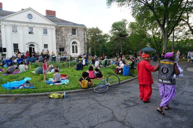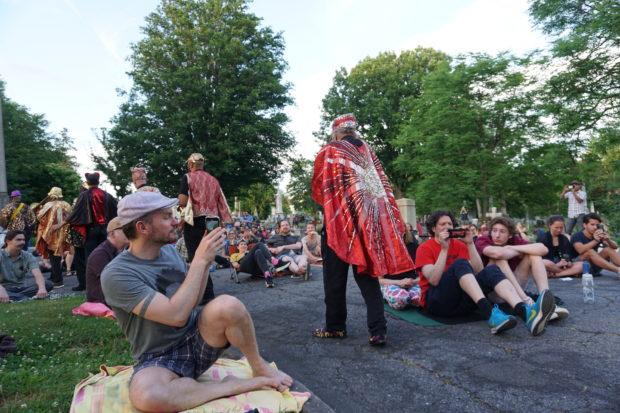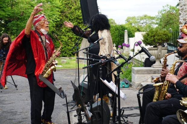 So I was moping hard, feeling real boring, real dull, real sad, and then just a couple days later I found myself in Woodland Cemetery surrounded by a crowd – an honest-to-goodness crowd, though it certainly wasn’t crowded, as everyone had enough space to spread out– of people all there to celebrate The Sun Ra Arkestra and it’s current bandleader Marshall Allen on the occasion of his 97th birthday.