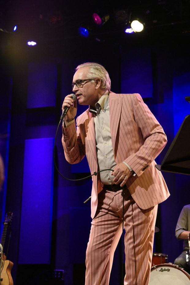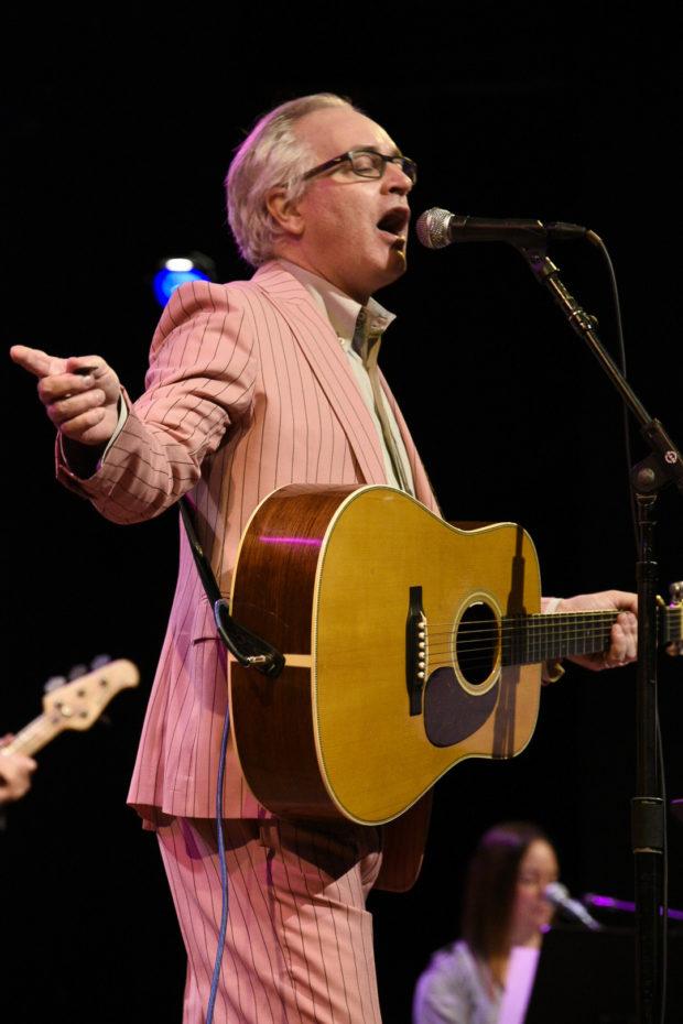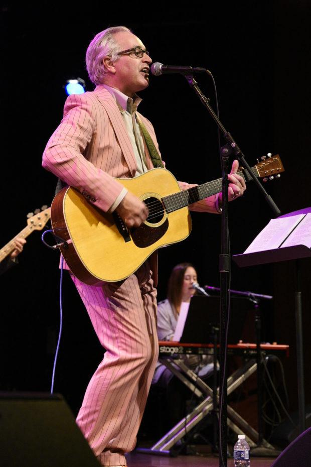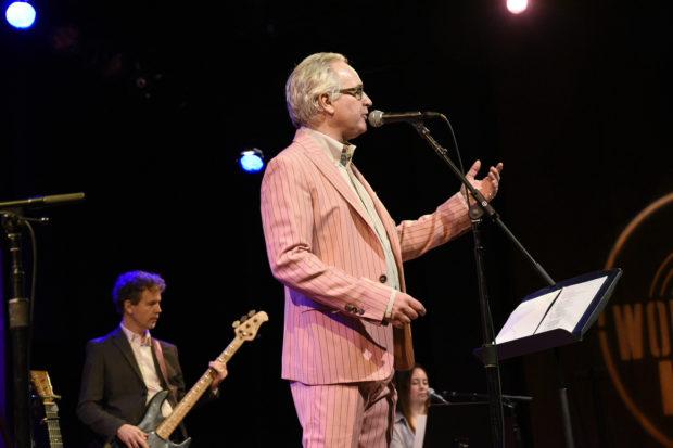 Boasting a muted pink pinkstripe suit and mixing breezy bossa nova melodies with witty wordplay, Wesley Stace‘s vibe was very lounge chic as he took the stage for Free at Noon today.