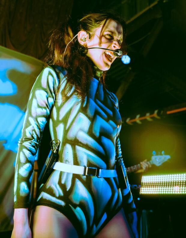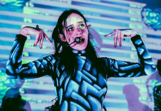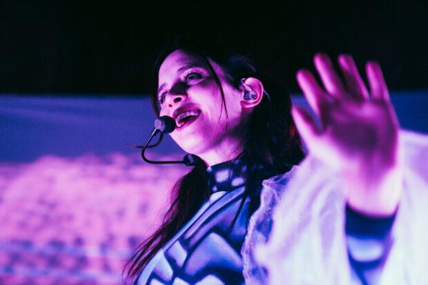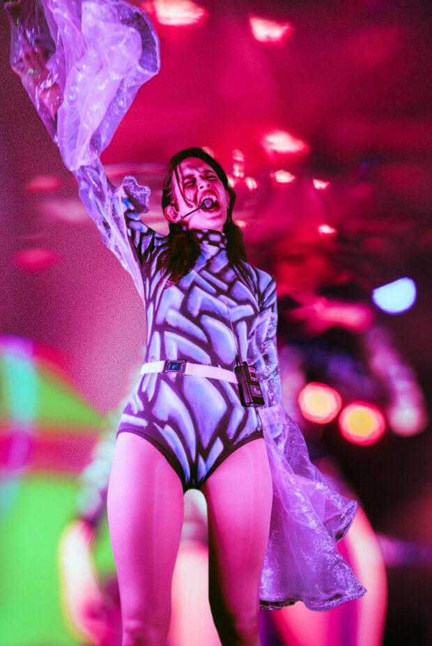 The show was narrated by the mysterious programmed face, Chaeri. In between songs, Tenenbaum would interact with the projection, asking questions and giving commands. Chaeri started off the song “Domino” by singing the opening note. At one point in the middle of the set, Chaeri became sentient, stating “I want to find purpose, more than just an image on a screen.” The duo stated the face was asking too many questions and programmed the face to destroy itself, which resulted in a montage of glitches and crazy visuals as the face combusted. Chaeri came back at the end of the performance, though, to prompt the audience to clap if they wanted to hear an encore.