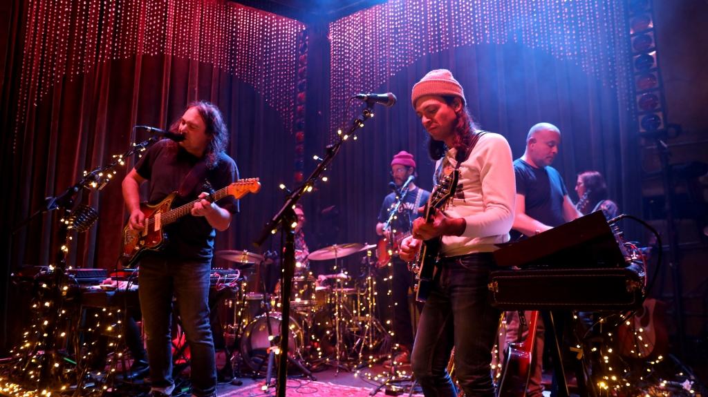 Scattered about the venue floor were friends and family of the band, tables with boxes of Santucci’s square pizza to feed them and yellow strings of Christmas lights crawling over every inch of the balcony and every piece of gear onstage.