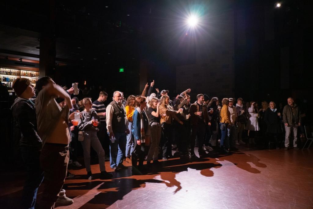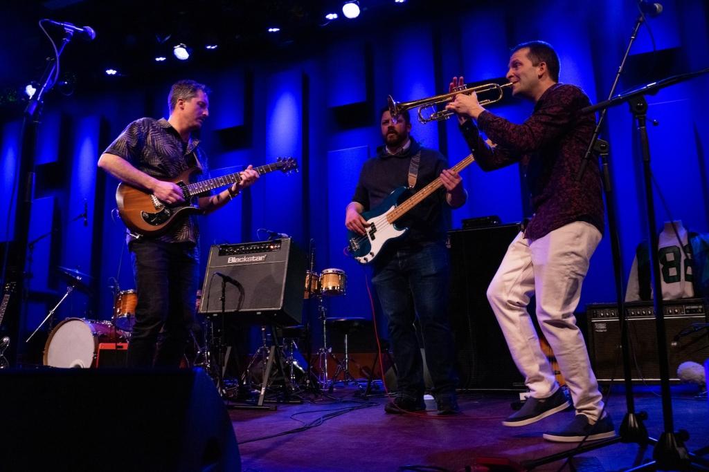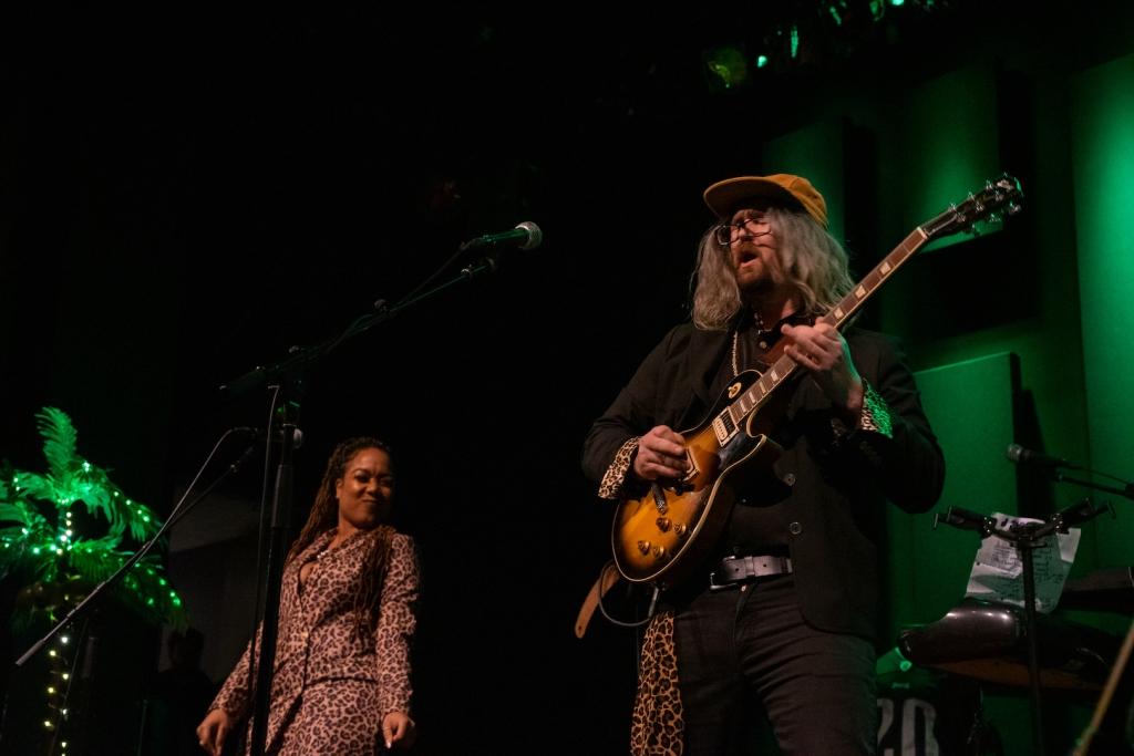 The trees were in fact light-up patio decor chosen by Chestnut Grove, the long-running Perkiomenville rootsy rock and roll outfit who was headlining the Music Hall. And it seems that many folks heeded Drago’s advice, since the room was packed — from the early arrivers dancing to opener Brick Nova, who ramped their set up with funky fluid jam rock into a fervent finale, to the crowd swaying to always-uplifting N’awlins-flavored modern rock of Stella Ruze, and finally an energized reception to Chestnut Grove punctuated by instrumental switch-offs, Eagles jerseys (go birds), inflatable balls bouncing around the room, confetti, and finally, every musician imaginable onstage to close the night.