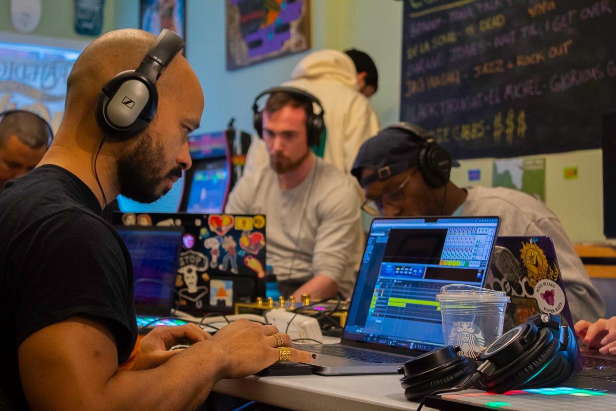 Anyone entering Cratediggaz Records last Friday night looking to pick through the store’s nicely curated selection of jazz, funk and hip hop records would likely be struck by the sight of nearly two dozen musicians of all ages, seated in stools, on the floor and shoulder to shoulder at a long table in the middle of the store. Armed with an assortment of drum machines, samplers and laptops, each musician worked silently in headphones, tapping drum pads and nodding along to their own private beat.
