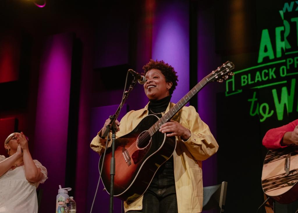 Setting up the night with introductory remarks, Black Opry founder Holly G spoke about the impact of the residency program, noting that Black musicians are often marginalized in the country music industry — a genre that they’re historically foundational in — and getting artists in spaces like this and raising their profile is essential to the genre’s future. Each artist played three of their songs in the round; Nashville icon and singer-songwriter Frankie Staton, one of the Black Opry mentors for the week, joined in on the performance, playing two of her songs and joining the ensemble for an encore cover of Whitney Houston’s “I Wanna Dance With Somebody.”