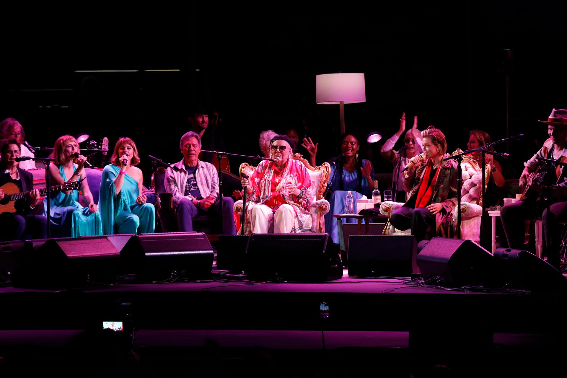 For Mitchell’s part, seated in a comfy-looking chair at center stage — the set was decked out with furniture and lamps inspired by her home — there was an air of modesty about the night, at least as much as there could be in a night that was all about her. She beamed with joy at the rounds of applause, but seemed reluctant to talk about the reason for it. Whenever somebody onstage offered a superlative about her (and practically everybody did), she graciously and quietly thanked them, and changed the subject. She shared funny anecdotes from her life that played into the music on the setlist, and engaged with the other musicians’ stories about her, some of which were sweetly self-deprecating: bum-rushing the stage at a Bob Dylan show, being asked to sing “Purple Rain” and telling Prince she didn’t know the words, going on a bizarre quest for recorded wolf sounds with Tim Hardin. (“We’re really at a Joni Jam now,” Carlile said after that last one.) “I was 25 when I did Newport for first time I was 79 when I returned,” she laughed about last summer’s tribute. “Viva la old age!”