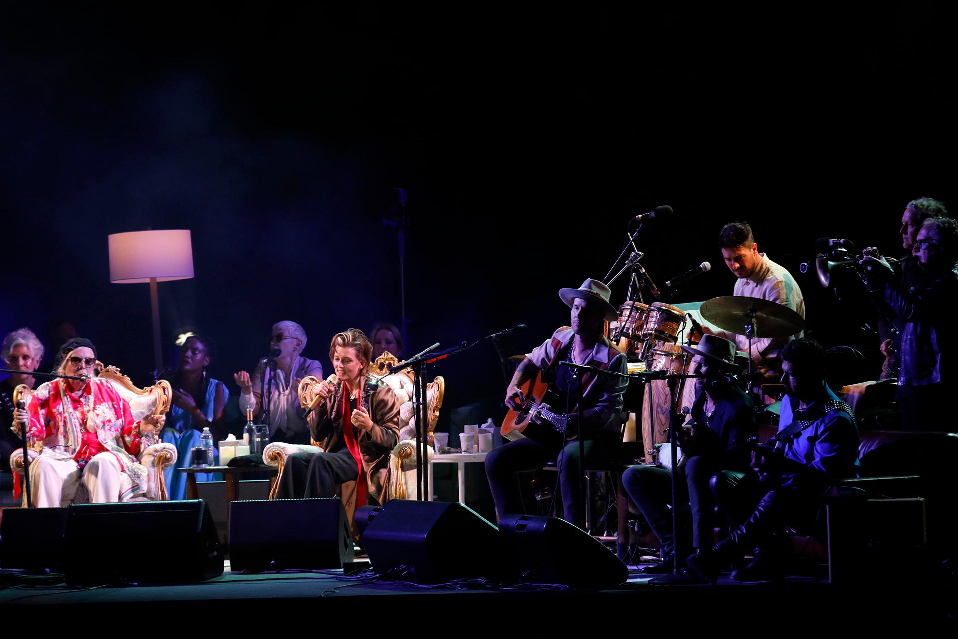 As Carlile explained in her opening set — where she and her wife Catherine dueted on the very Joni-esque “You And Me On The Rock” from 2021’s In These Silent Days — the seed of the concert came from informal jam sessions Mitchell regularly has at her Laurel Canyon home, which are attended by a range of players from Hozier to Chaka Khan. “It’s not gonna be a show like you’ve ever seen before,” Carlile said of the headlining set, billed as The Joni Jam. “It’s more going to be like holding a snow globe and looking inside, seeing that house with the lights on…seeing into Joni’s living room, and how she stepped back into music in a profound way.”