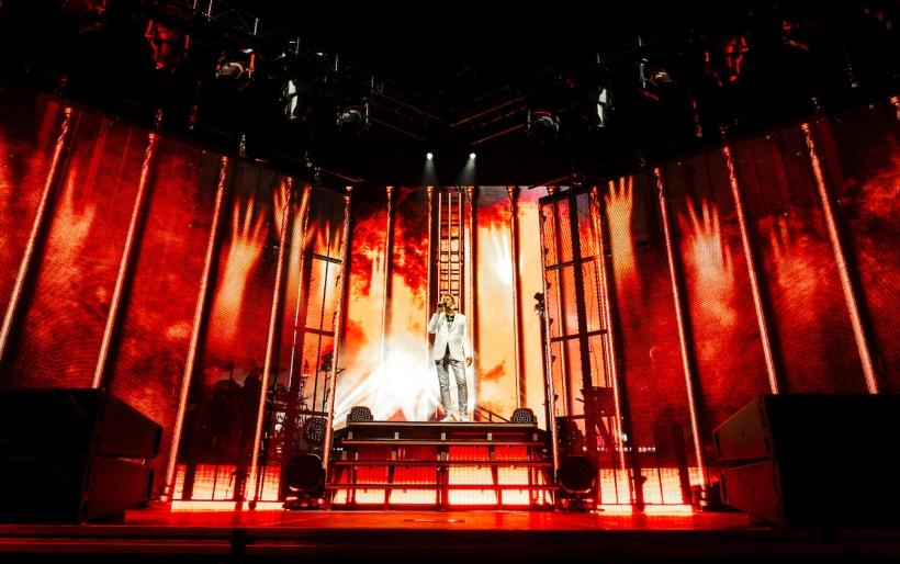Duran Duran began their set with the full production: playing a short film of some otherworldly astronauts on the two large moving screens as the stage began to fill with a dense fog. Fans cheered on as original members Roger Taylor (drums), John Taylor (bass), Simon Le Bon (vocals), and Nick Roades (keys) take center center-stage silhouetted by the bright lights. The band members took to their instruments bringing the new wave music of “Night Boat” and leaving singer Simon on top the steps with an eerie red glow of visuals of hands reaching out. From the floor, the stage felt even bigger than the previous two acts, with the drums and keys masked behind the screens on the now on the stage rather than suspended. They kicked up the tempo with “Hungry Like the Wolf” early in the set. Taylor could be seen powerfully moving around the stage joining touring guitarist, Dominic Brown, hyping up the crowd with the flare of their guitars.