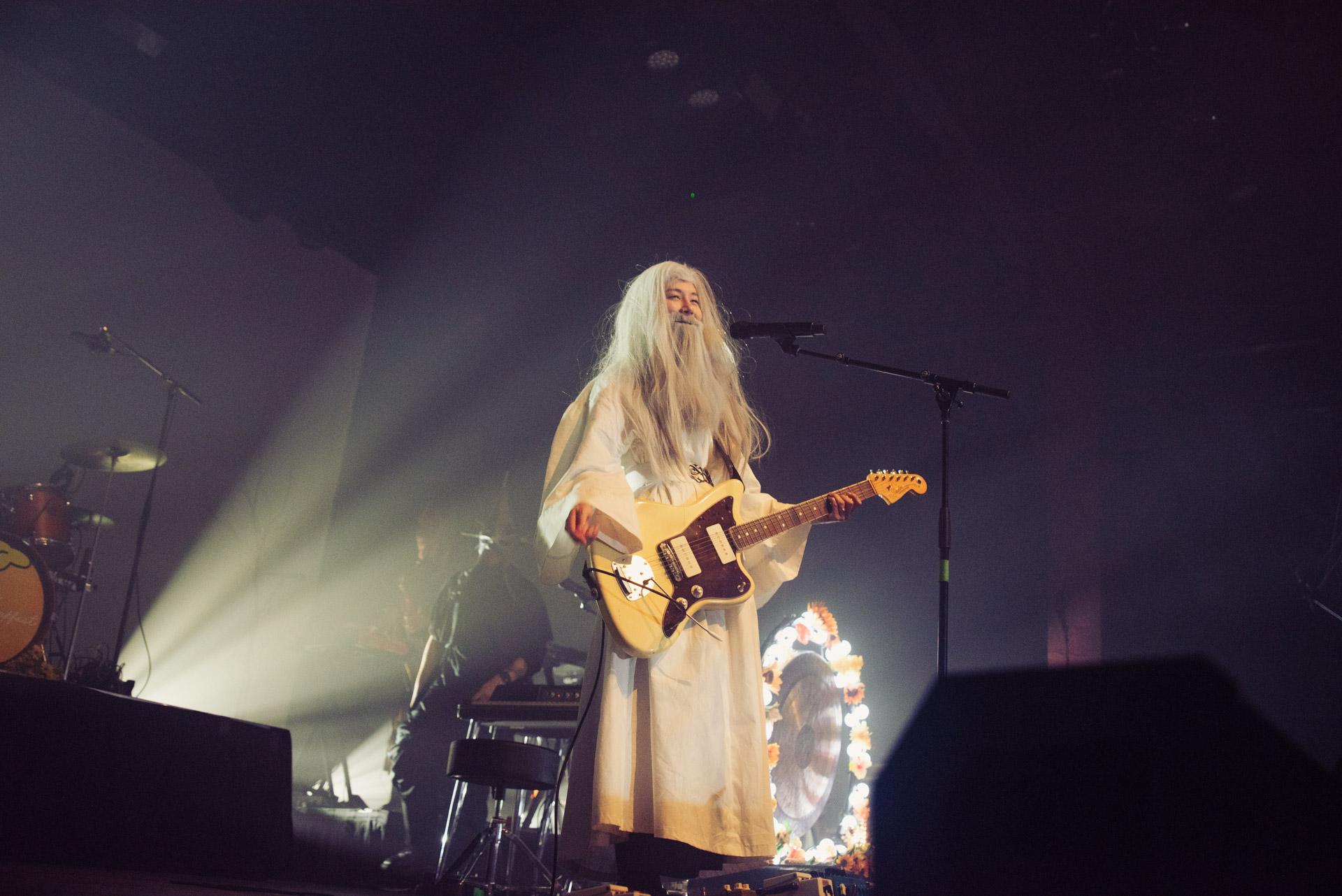 After a break, a figure came back on stage: it was Sherman dressed in a nude bodysuit and loincloth, bent over at the knees. Pretty soon we realized she was Gollum, or Smeagle if you’re feeling considerate, from The Lord of the Rings. After introducing Japanese Breakfast as her “precious,” Smeagle hobbled off stage and the whole JB crew entered dressed as wizards and elves and dwarves from the series. Michelle Zauner herself was dressed as the evil Saruman, identifiable by her long white hair, robes, and staff. Rousing musical themes from the movie played between songs, and a loop of scenes from the movies changed with each song.