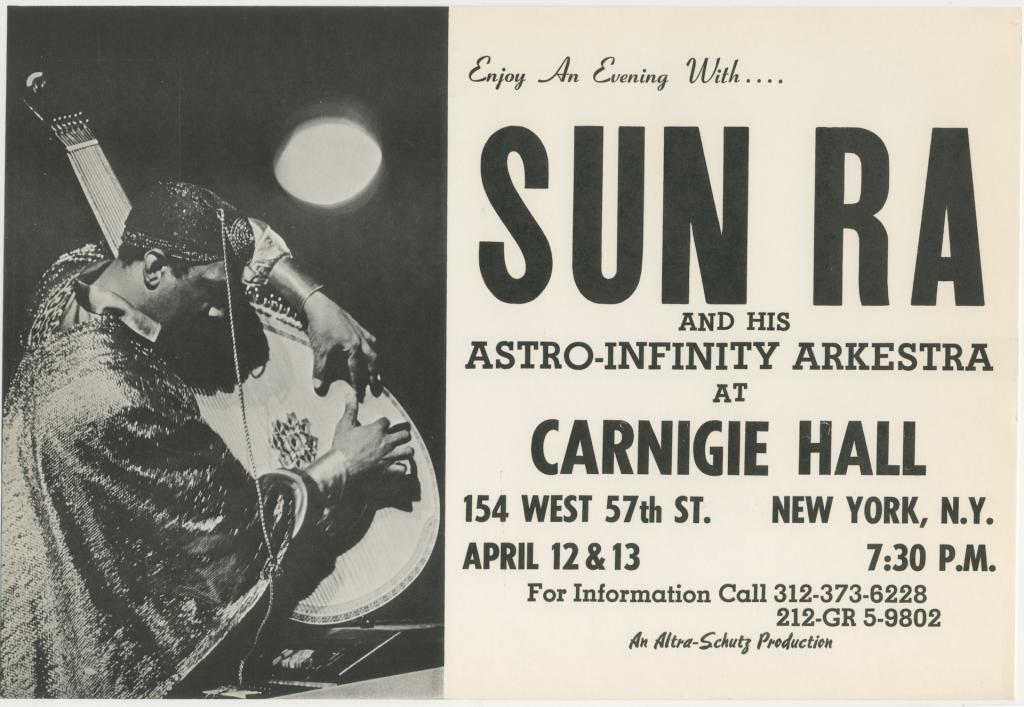 Enjoy an Evening with Sun Ra and His Astro-Infinity Arkestra at Carnegie Hall flyer. April 12 & 13, 1968. Altra0Schutz Production. 14 ¼ x 9 ¾ in. Kislak Center for Special Collections, Rare Books and Manuscripts; University of Pennsylvania Libraries.