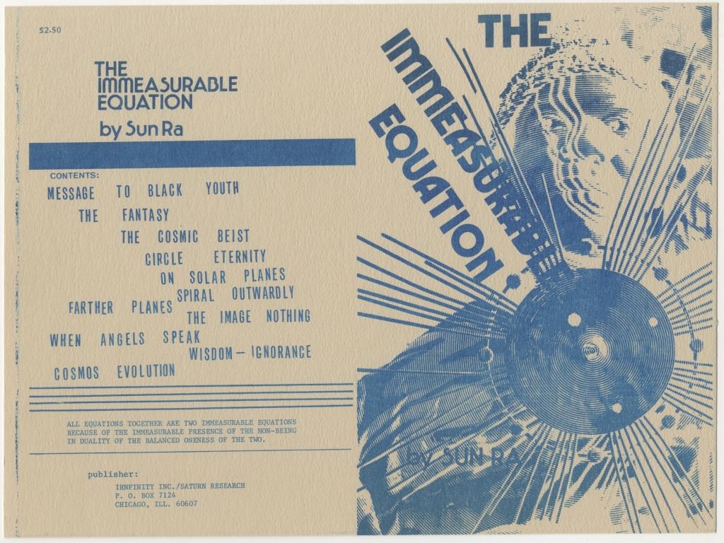 The Immeasurable Equation by Sun Ra wrap, screenprinted in blue ink on grey paper stock. 8½ x 11 in. Unfolded alternate cover design for Sun Ra poetry book. Chicago: Ihnfinity Inc/Saturn Research, ca. 1972. Kislak Center for Special Collections, Rare Books and Manuscripts; University of Pennsylvania Libraries.