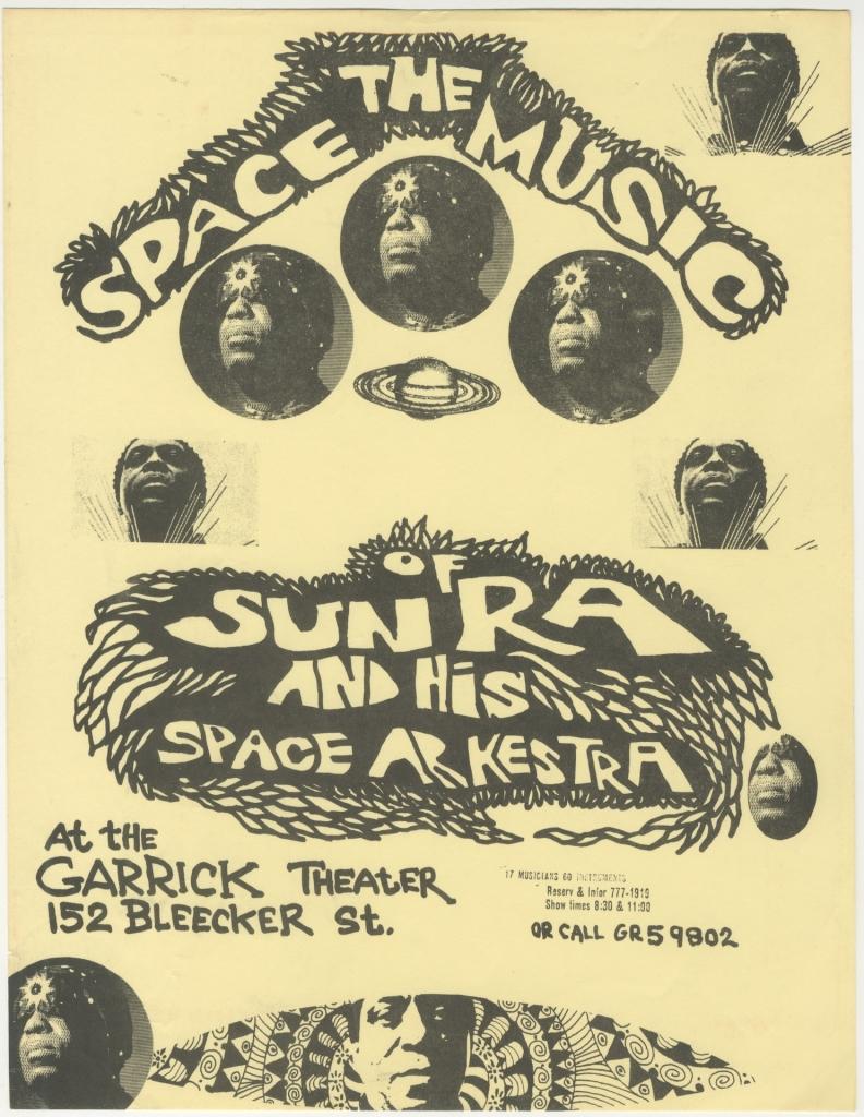 The Space Music of Sun Ra and his Arkestra at the Garrick Theater. 8 ½ x 11 in. Flyer for Sun Ra performance on Bleecker St. ca. 1960s. Kislak Center for Special Collections, Rare Books and Manuscripts; University of Pennsylvania Libraries.
