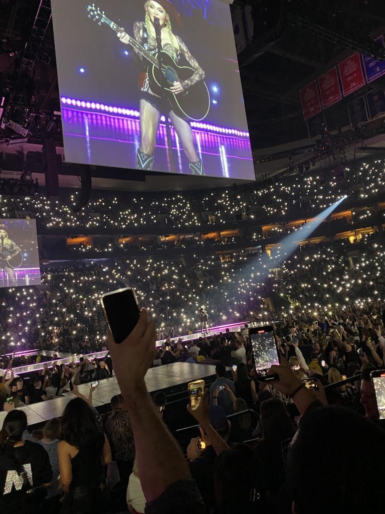 As things shook out, the performance clocked two hours and fifteen minutes, and hit on the breadth of the chameleonic pop icon’s four-decade career, from “Burning Up” to “Bitch I’m Madonna.” As the night opened, the autobiographical intentions of the Celebration Tour were clearly outlined, with master of ceremonies Bob The Drag Queen (in a flowing and ornate Marie Antionette gown) narrating a rapid-fire visual montage of news clips and vintage photos on many screens draped around the arena. Atop a grid of catwalks crisscrossing the floor, Madonna and a squad of dancers strutted their stuff to a run of her early 80s material.