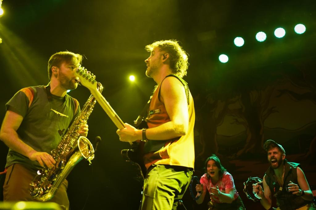 Sammy Rae & The Friends CAMP Tour is dedicated to the tried and true elements of going out to the woods to pitch a tent and roast marshmallows. The stage was decorated with tree stumps, a drink cooler, camping chair, bits of moss and foliage growing around the stage and a road post, boards pointing the way to various cities. The Friends entered the stage with lanterns leading the way single file, once they found camp the show could begin.
