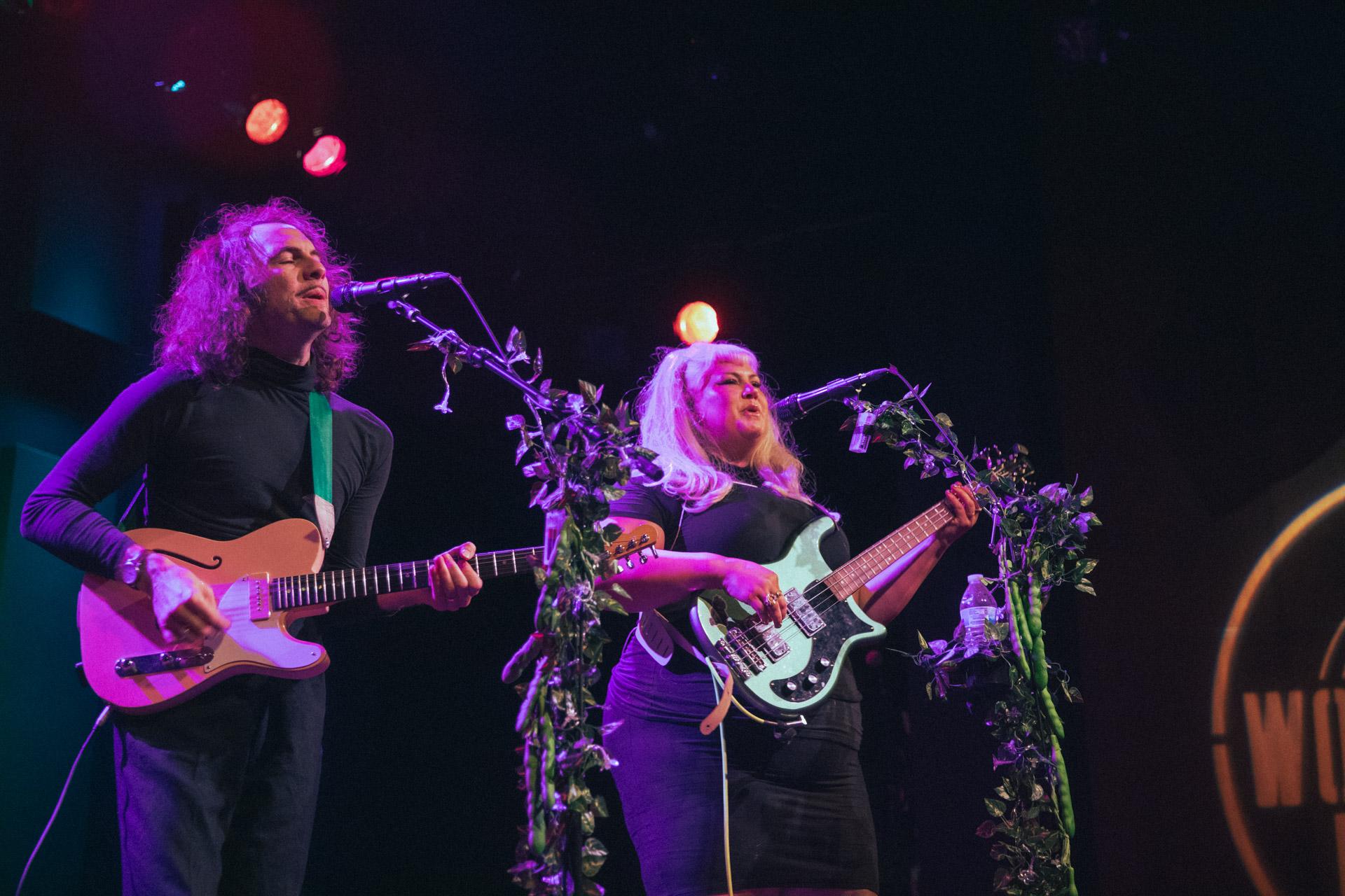 “Forgot to turn my beans on,” Will Sprott said, as he reached down to flip a switch. The tropical flower and coconut print decorating the front of his keyboard lit up. Mic stands wrapped in vines and bean sprouts, belonging to bassist Shannon Shaw and guitarist Cody Blanchard, followed suit and twinkled onstage. Very camp.