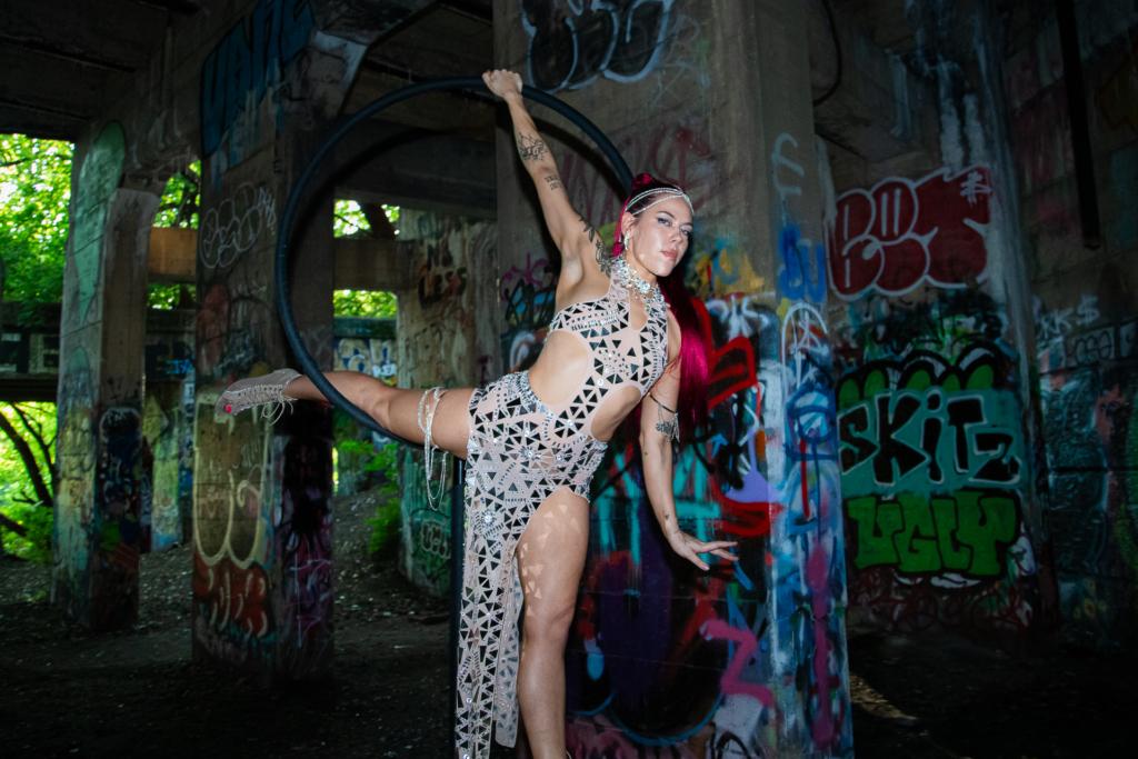 The first step was finding a place to train. She discovered the Philadelphia School of Circus Arts and scheduled a private lesson, her first taste of aerial in years. Stepping into the studio, she was immediately entranced by the lyra (aerial hoop) and silks rigging. With her background in gymnastics and dance, the aerial disciplines came naturally. Under the guidance of skilled instructors, Electric Honey diligently relearned aerial basics and technique.