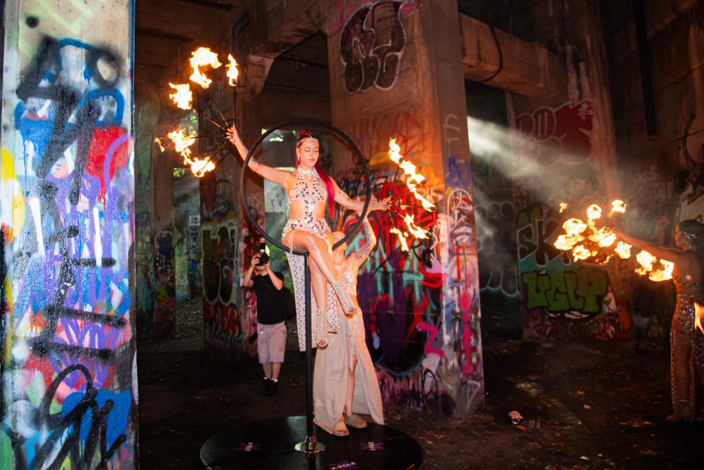 Over the years, Electric Honey has honed her lyra skills, continually pushing herself to new heights. One of her most breathtaking acts involves combining her aerial artistry with the ancient art of fire performance. Adorned in flowing costume with flames dancing around her, she executes stunning tricks and poses on the lyra, creating a mesmerizing display of beauty and power.