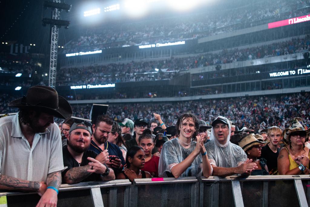 Upon stepping onto the field, the rain was coming down, although not as hard as half an hour before, when fans were evacuated until further notice. Puddles of water covered the floor as fans splashed around, dancing in the rain. Concertgoers had soaked through their shirts. The majority of them had not even brought a poncho to protect them from the intensity of the storm. The crowd of 60,000 anxiously waited for Zach Bryan to take the stage, after a lengthy and lightning-filled delay. While the circumstances were different from what Bryan had planned, with his backyard set-up, fans seemed just as excited as they had been three hours prior.