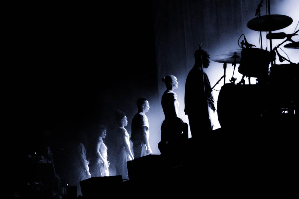 In “While U Can,” two of his dancers held a white sheet across the stage that took on the color of God Said No’s baby blue hue. It was malleable, transforming into a new backdrop based on its surroundings. In “Drifting,” its dream-pop edge was serene, especially with the sample of Ivy’s “Edge of the Ocean,” where the sheet mimicked the lyrics’ desire for a deep blue sky. Like an Ivy song, they mostly stayed away from electronic instruments, favoring a more organic sound; Sterling’s kit mirrored this in the song, staying away from a drum pad and whipping out 16th notes on the hi-hat, followed by bass thuds. In “Less of You,” bassist Trey Graves layered some synth-soaked notes over the organic drums.
