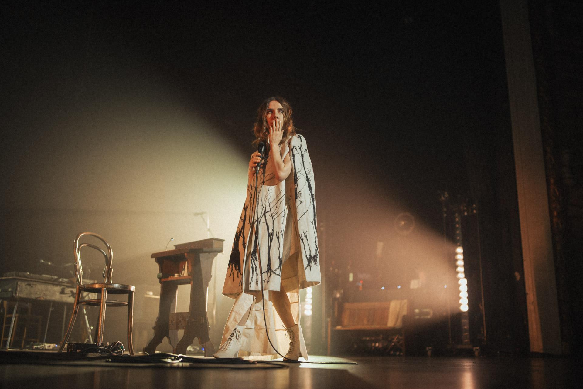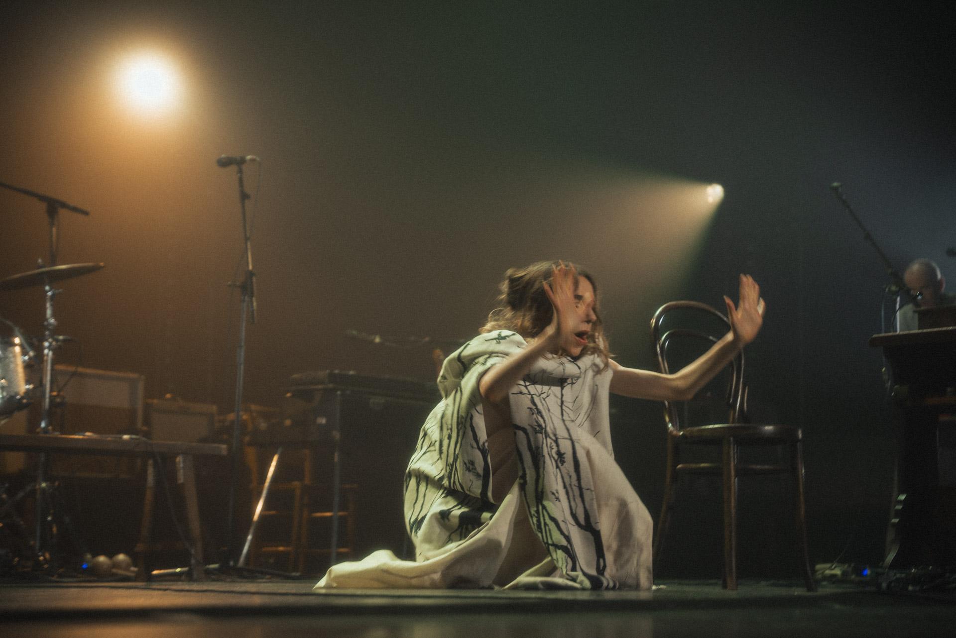 Resembling the best conceptual play you never saw, PJ Harvey and her band opened the evening with a front-to-back performance of the new record. The near-mythological artist was hypnotic, enchanting The Met with her higher vocal range and eccentric, abstract lyrics, both statements of her latest work. She danced methodically yet fluidly, taking measured steps followed by an abrupt pause, then sank to the ground; all her moves were poses. From the high mezzanine where I sat, she appeared as a grounded, glowing fairy, sweeping across the stage, so fiercely in command but acting with zero aggression.