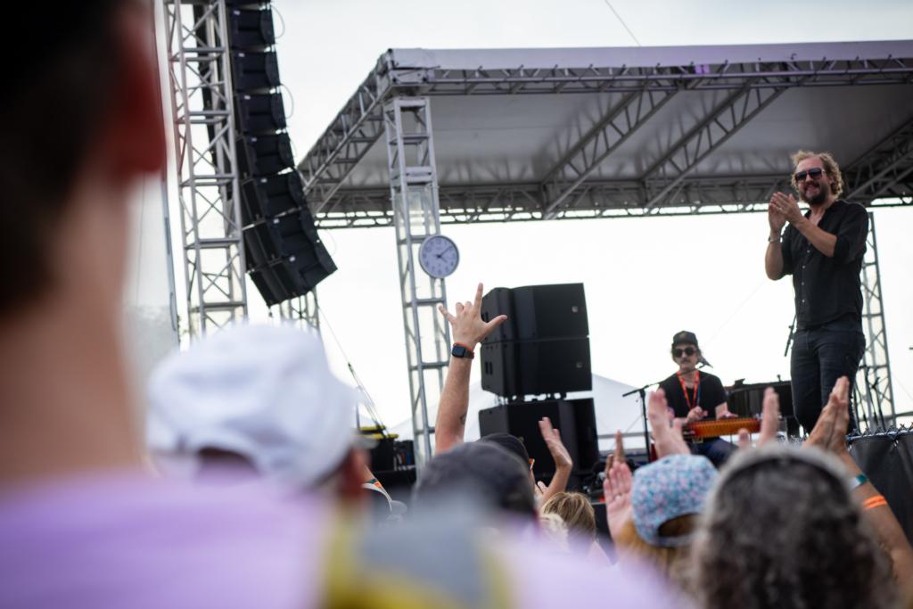 Phosphorescent’s performance on the River Stage for these years XPoNential Music Festival was a masterclass in atmospheric Americana, infused with the contemplative warmth of their latest album Revelator. Matthew Houck, the creative force behind Phosphorescent, brought an intimate yet expansive energy, reflecting the emotional journey his music often explores. Opening with “C’est La Vie No.2” from 2018’s C’est La Vie, Dominic Billett’s mallet sticks created a hollow, resonant sound while Bobby Hawk’s fiddle cried between verses. “It’s good to be here, thanks for having us… It’s a beautiful day out here, isn’t it?” Houck mused, before reflecting on his music. “My songs sound like nighttime songs, so sometimes it’s weird to perform them when it’s so light out.”