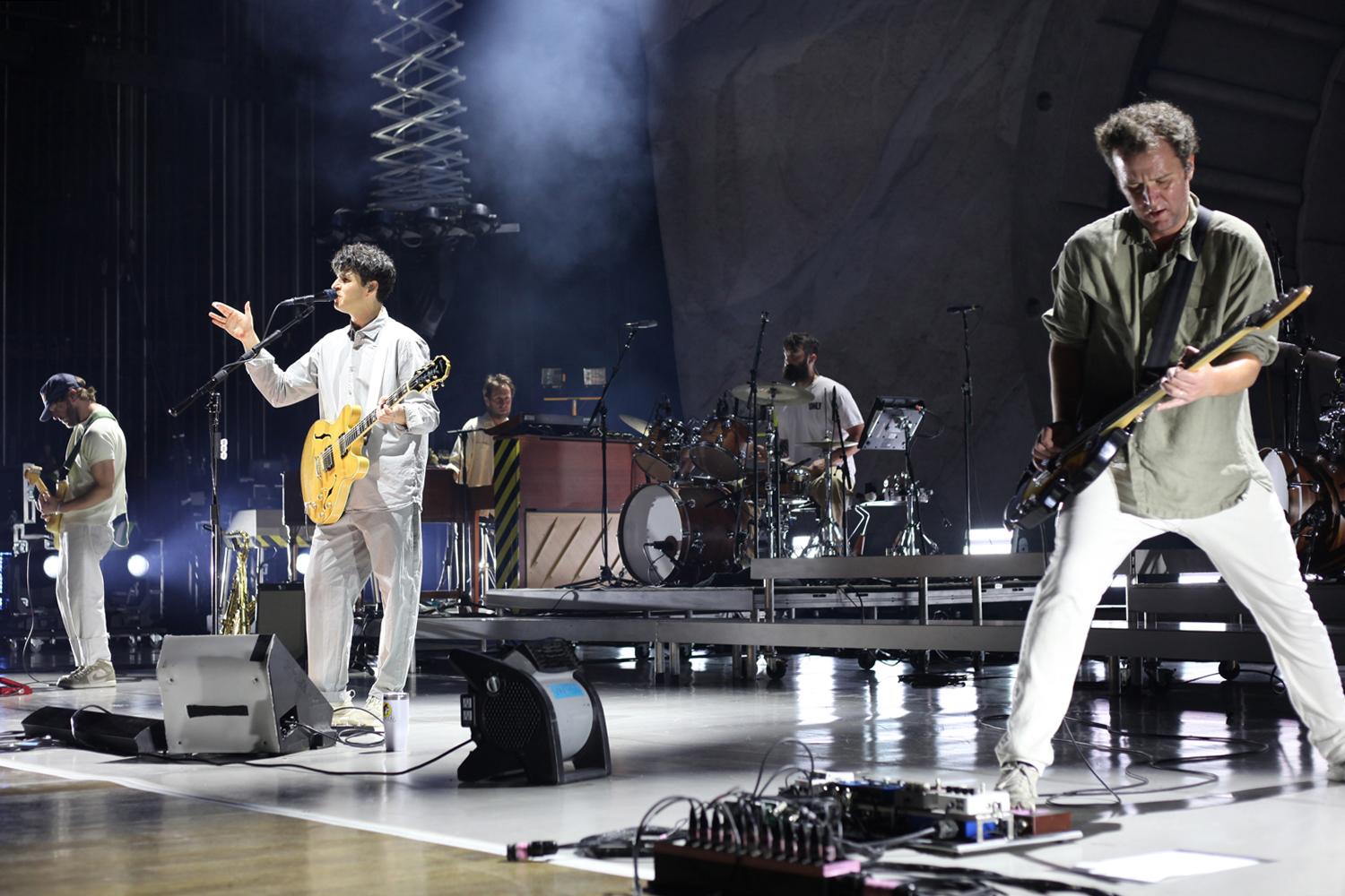 Vampire Weekend came out playing “Cousins,” “Campus,” and “Bryn” from their first two albums with nothing but bright white lights and a backdrop of their band name. Once they launched into the fourth song, “Ice Cream Piano,” the set was raised, the rest of the band were revealed, and the scenery of a large sewage drain stood behind them with fake concrete and construction workers in the background. Frontman Ezra Koenig is a great performer, adding stories and conversations with the crowd throughout the music.