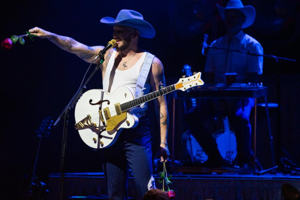 Orville Peck took the stage to the Bob Dylan song “All the Tired Horses” playing over the speakers and a theater full of excited fans cheering. He and his band eased into the set with “Big Sky.” After a few songs, Peck let everyone know that the night includes songs from all his records (not just the newest one), and that was not a lie. One could say the set included “all the fan favorites,” but it seems like every song of his is a “fan favorite.” The 90-minute performance was a gentle balance mixing his high energy, dance-worthy songs with slower, sentimental songs from his 2019 album Pony to his newest 2024 album Stampede. It was completed by serenading everyone with “Midnight Ride” over the house speakers as the crowd filed out onto Broad Street.