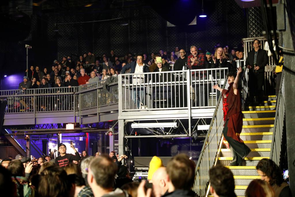 The night got under way with an in-your-face performance by the Berklee-formed, Brooklyn-based experimental dance outfit Model/Actriz. Mixing densely jarring noise rock tones and raw rhythmic energy with snappy post-punk grooves (and occasional metal-adjacent shrieks), the band was entertaining, but defiantly confrontational, in their sound as well as their presentation. Vocalist Cole Haden raced about in an unhinged frenzy, and then between songs one and two gave the crowd static for not dancing, saying this audience “clearly” was seeing them for the first time and insisting that they move. Haden grew up in Delaware, and maybe it’s been a while since he’s spent any real time here, but berating a Philly audience is never the move if their energy isn’t where you want it to be. Thankfully he changed tactics halfway through the set, broke the fourth wall, and dove in the crowd to dance with them. It’s a move Haden seems to be known for, but it successfully turned the temperature up, and trailing a comically lengthy microphone cable behind, he waltzed across the venue, ascended the balcony stairs, and made an about-face turn, serenading a much more energized room from above.