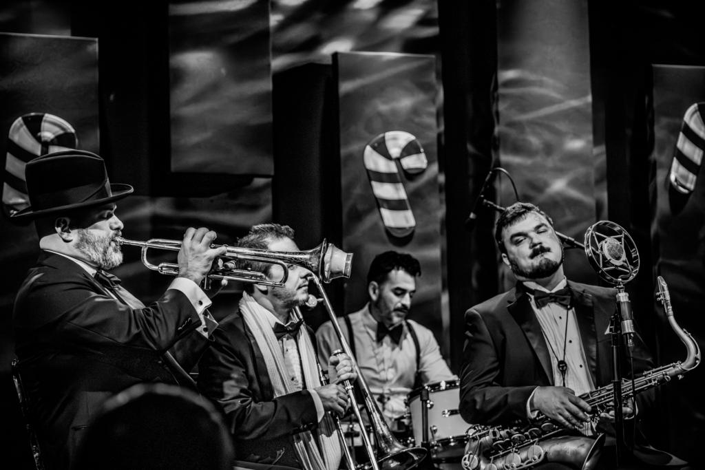 A self-directed intermission brought on the first of two skits, with members of the band jokingly advertising for Squirrel brand saltwater taffy like a radio commercial circa 1930. Met with a hefty laugh from the crowd, they jumped back into their Christmas compositions, performing “Carolina Christmas,” “Gift of the Magi,” and a traditional Jewish holiday song called “Purim Nigrum.”