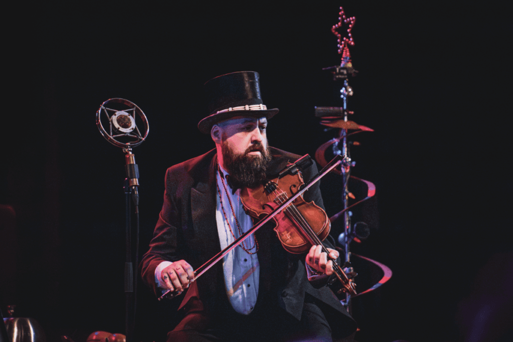 The Zippers followed up with holiday highlights from their 1998 album, Christmas Caravan, playing through “Winter Weather,” “My Evergreen”, and “Hot Christmas.” While branded as Christmas tunes, each song balanced classic swing motifs as well, with “Winter Weather” featuring velvety vocals by singer Cella Blue and “Hot Christmas” providing a chance for each player to show off their chops, soloing over a fast-paced take on bebop jazz. Fiddle player and vocalist Dr. Sick then led the band into “Suits Are Picking Up The Bill”, delivering a vaudeville-esque song and dance that capped off with his bow spinning wildly through the air and into a timely catch on the last downbeat.