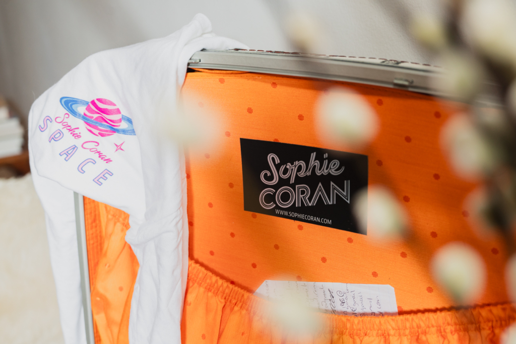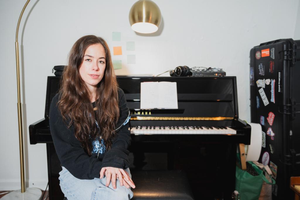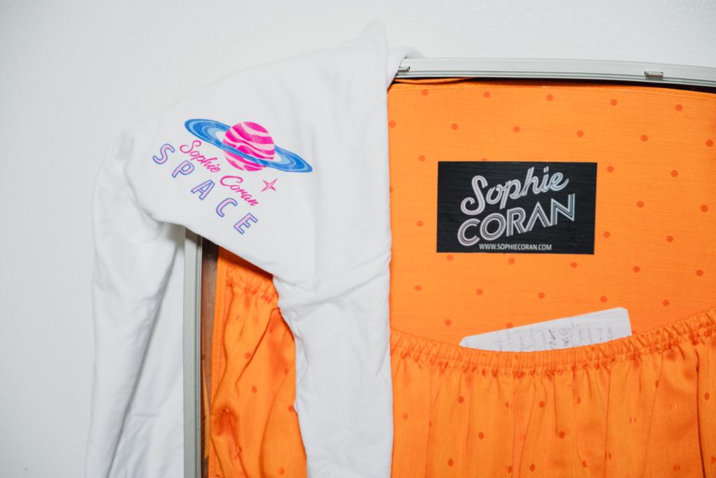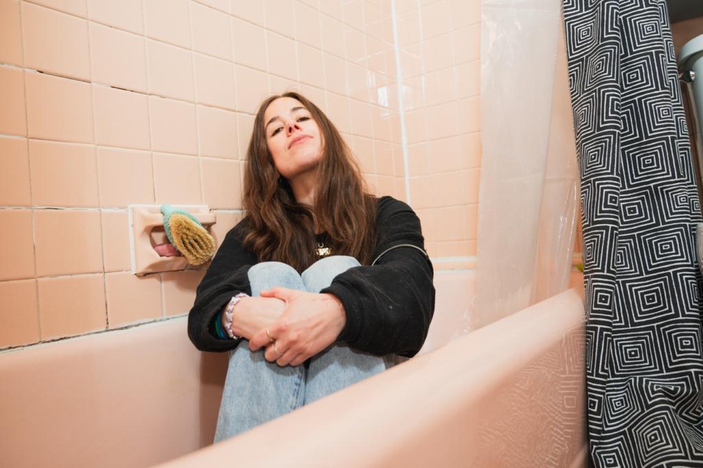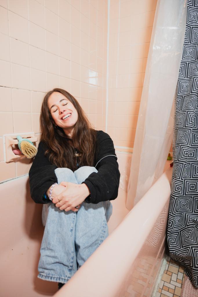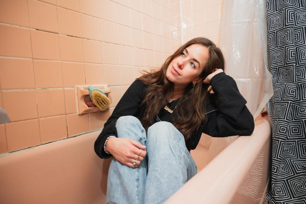 In a relatively brief time, and as busy as she is, Coran has been able to make the place her own. One room is dedicated entirely to her music, featuring no fewer than six pianos — one upright, two Nords, one mini Yamaha, and two toy pianos — as well as a writing desk, and a wall adorned with Post-Its scribbled with lyrics and notes. The living room is stacked with chic storage bins that are tidily organized, in a teeming-with-merch-and-memories kind of way. A pile of novels checked out from the library sits on a stand in the hall, leading back to Coran’s favorite spot — a cozy bathroom fully covered in salmon-colored tiling.