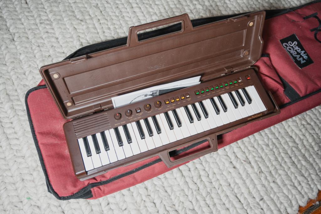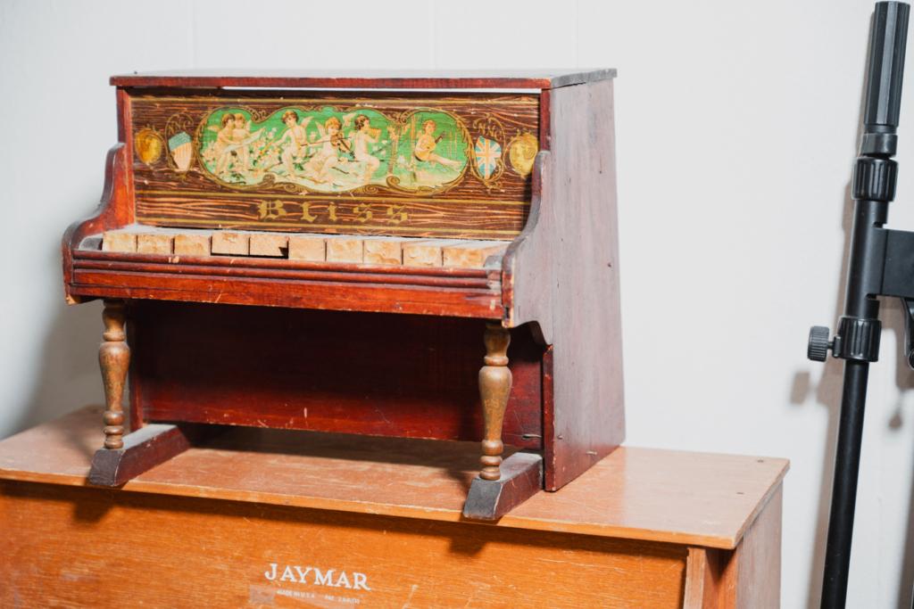 In the mix with her pianos that are more readily used, Coran keeps two wooden toy pianos. “I became obsessed with toy pianos because, when I was 10 to 16, I went to the Walden School in New Hampshire, which is for young musicians. It teaches composition, and I learned you can compose for toy pianos too.” The smaller one on top was picked up for cheap at an estate sale, she says, while the Jaymar at the bottom was a gift from Coran’s grandmother.