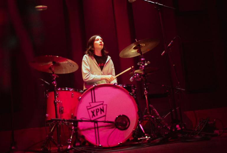 This afternoon, bathed in low red light, Horsegirl showcased their aesthetic and the album for a packed house at World Cafe Live, treating today’s Free At Noon to seven of Phonetics’ 11 songs, with a throwback to their 2022 debut Versions Of Modern Performance on the song “Anti-Glory.”