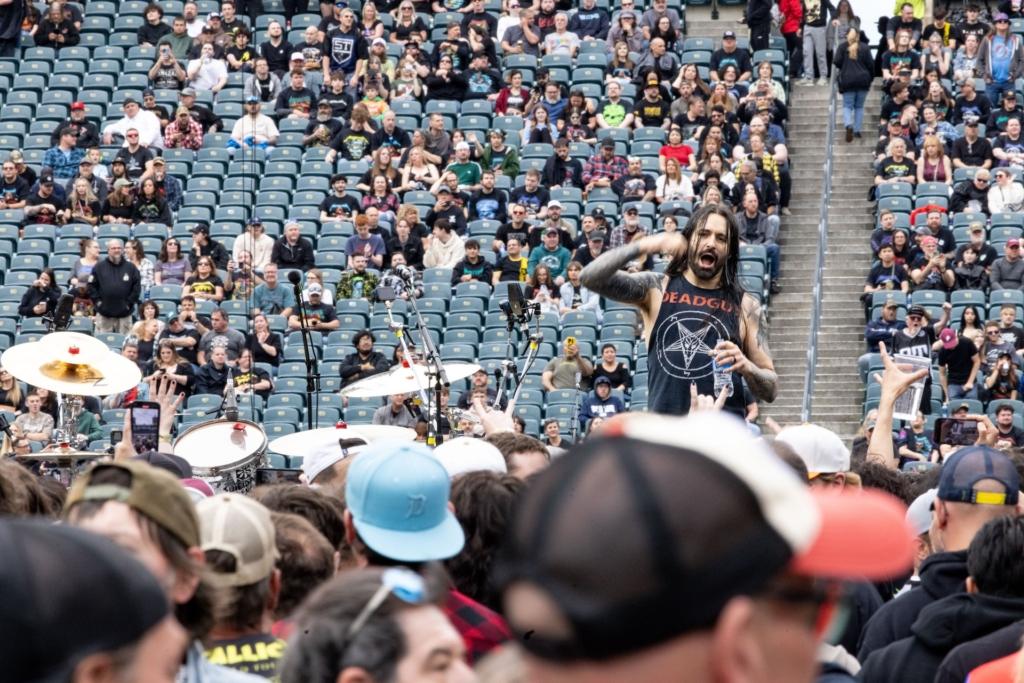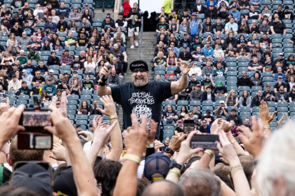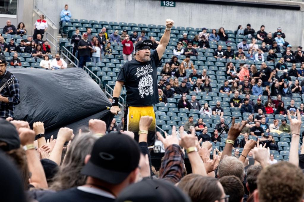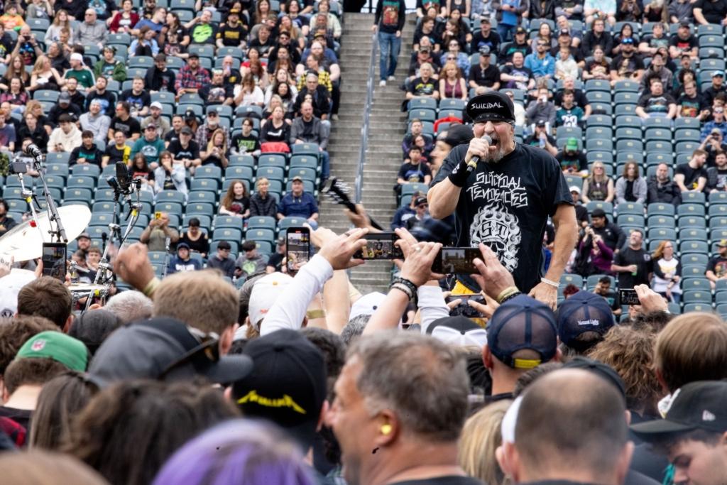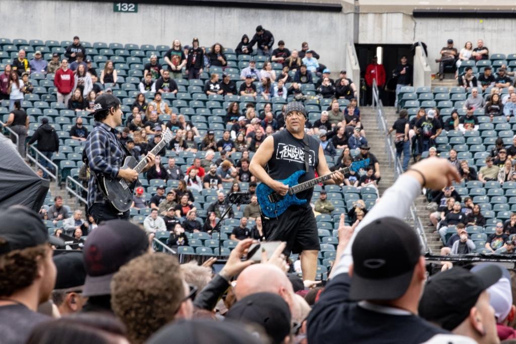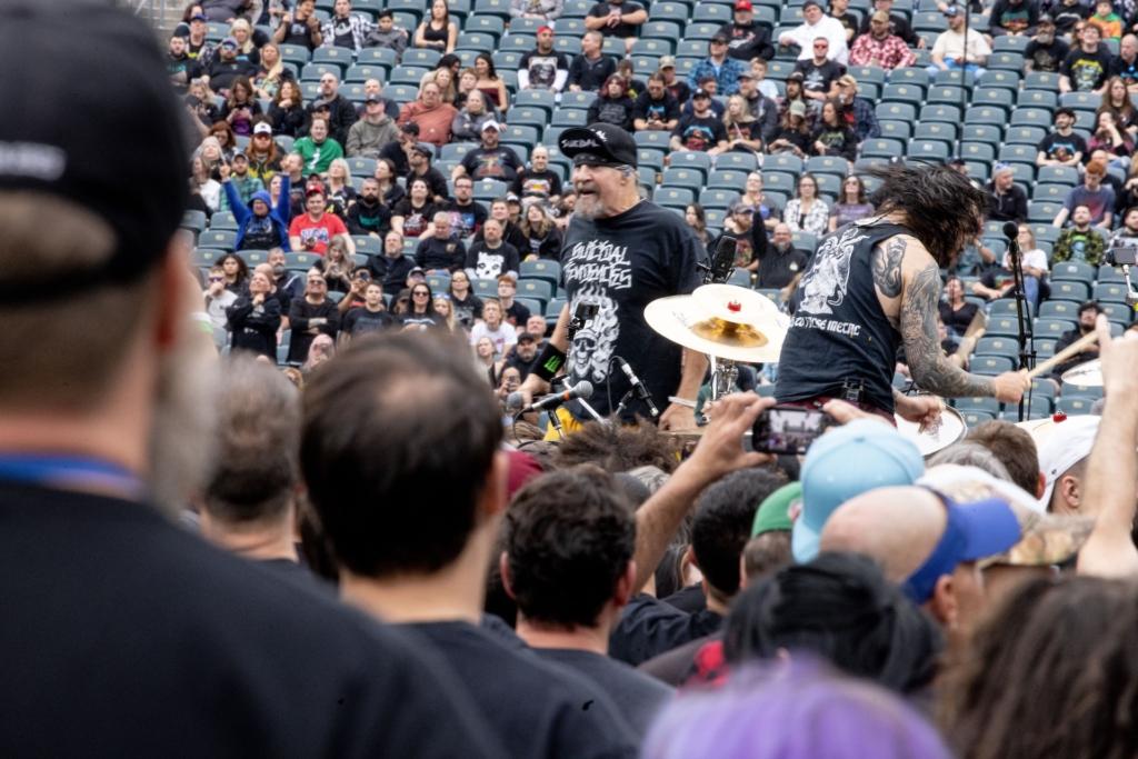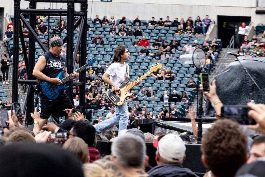 On Sunday, veteran SoCal thrashers Suicidal Tendencies took the stage to a warmly-received, heavily-played set. The only original member of the long-running band is vocalist “Cyco” Mike Muir, though the current lineup features Dillinger Escape Plan’s Ben Weinman on guitar, Jay Weinberg (son of Max) on drums, and bassist Tye Trujillo, son of Metallica’s Robert Trujillo (who played in ST from the late 80s through the 90s). An awesome moment happened during the iconic “Institutionalized” when dad popped up sidestage to pump his fists and cheer on his kid and the rest of his old band.