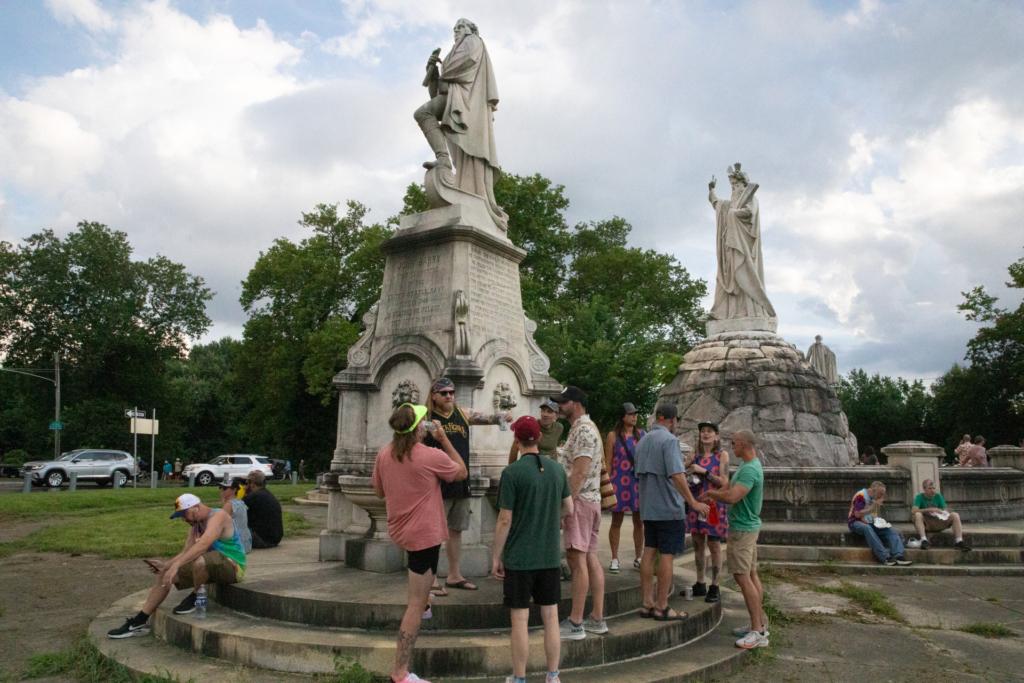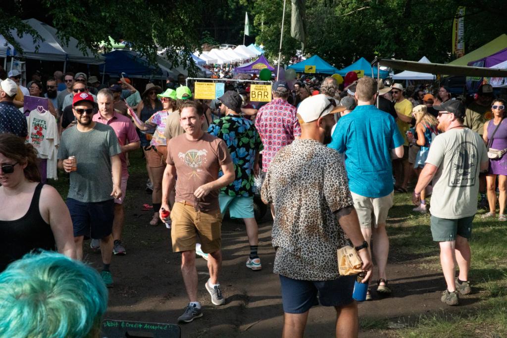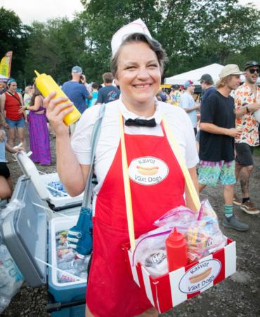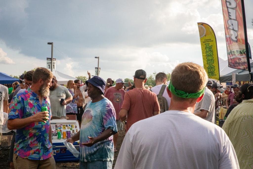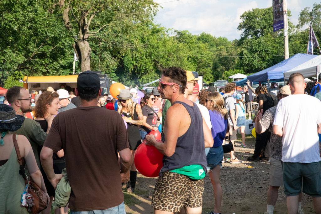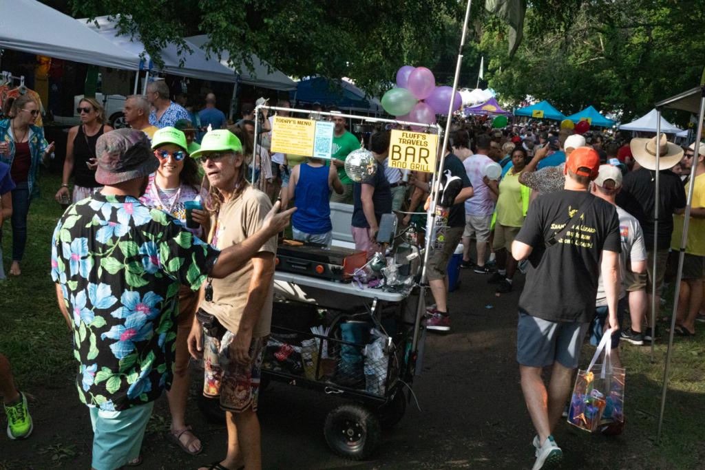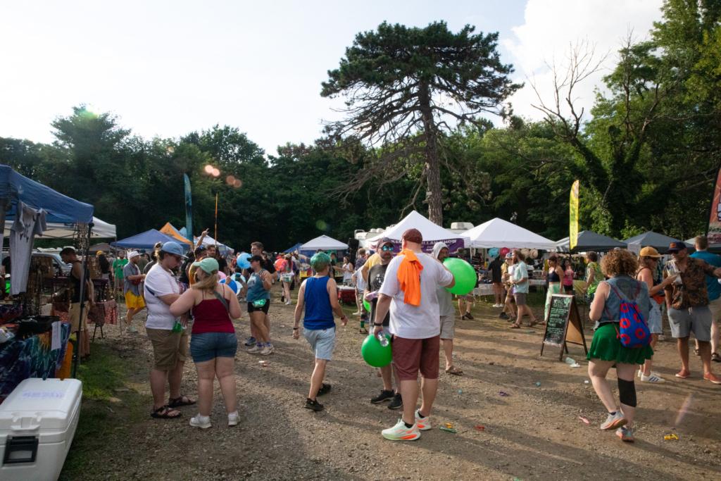It’s sticky and sweaty — especially in the the corner of the tree grove where any breeze is blocked on all sides — so much so that the crowd, wandering and blankly observing their surroundings, seems in a daze. (Is it the heat? Is it ~*other*~ factors?) At the same time, Shakedown Street is a remarkably wholesome environment. Old friends embrace, catching up for the first time since their last show (whether that was last year or last week). Groups of fans play music on guitar and dumbek. Crafters sell handmade clothes, jewelry, and artwork, decked out in vibrant greens, reds, yellows, and blues. The more adventurous people in the crowd dressed up creatively — one hot dog vendor was decked out in 50s diner attire — and food and hospitality abound.