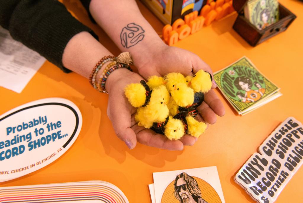 She held the puffy baby chicks with her hands cupped together and gleefully pointed out the mini records they had on them made by miniature artist Melanie’s Mini Place. “When there’s a little kid in here and they’re giving their parents a hard time, I have things for them to hold.”