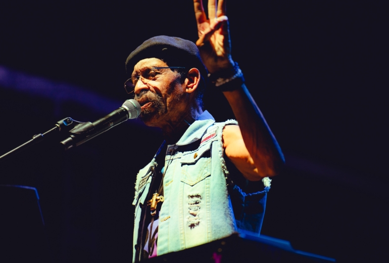 The band came out swinging with a hard-swinging version of “Baby Brother” from their 1971 classic All Day Music. In between the song’s main groove and Latin breakdowns, keyboardist / singer Lonnie Jordan lit the crowd up with some Sly Stone-style, churchified organ runs. Jordan — a founding member of War — led the band with charisma, belting out songs and disarming the crowd with quips and sly jokes. After “Baby Brother” broke down into a brief but thunderous drum solo from Sal Rodriguez, Jordan broke into a monologue, backing himself on organ. From there, the band launched into the slick, understated groove of “Slipping Into Darkness.” During another organ break, Jordan chided the crowd: “I smell weed, and it smells good. I’m getting high…contact high.” Between the song’s slinky rhythm parts and James Baker’s razor-sharp guitar solo, it’s surprising how strong and progressive the song still sounds nearly 50 years after it was composed.